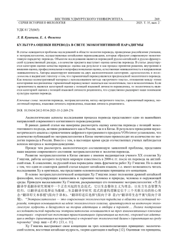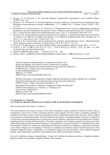 В статье освещаются проблемы исследований в области экологии перевода, проводимые российскими учеными, и экотранслатологии, осуществляемые китайскими переводоведами, которые образуют современную экокогнитивную парадигму перевода. Объектом исследования является переводной русско-китайский и русско-французский художественный дискурс, а в качестве предмета выступает оценка качества перевода. В статье дискутируется категория оценки качества перевода: оценка как результат и как процесс принятия решения, внутренняя и внешняя оценка, профессиональная и непрофессиональная оценка, естественная эквивалентность и направленная эквивалентность. Авторы акцентируют внимание на двух аксиологических категориях: гармоничность и экологичность и выдвигают гипотезу о том, что гармоничный перевод является предпосылкой экологичного перевода. Как показал иллюстративный материал с использованием метода «встречного текста», отношения между этими категориями неоднозначны: гармоничный перевод может оказаться как экологичным, так и неэкологичным. Если гармоничность является категорией оценки с позиций языковой личности переводчика, то экологичность является категорией оценки с позиций языковой личности реципиента, что существенно расширяет наше понимание культуры оценки перевода.