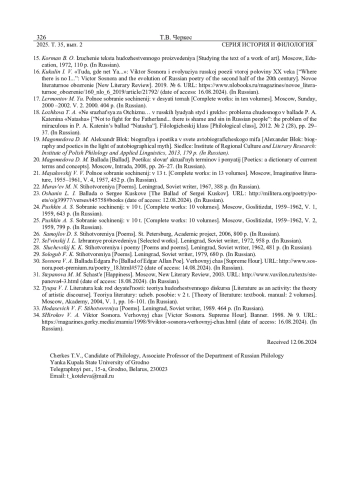 34. Широков В. А. Виктор Соснора. Верховный час // Знамя. 1998. № 9. URL: https://magazines.gorky.media/znamia/1998/9/vikt Поступила в редакцию: 12.06.2024. or-sosnora-verhovnyj-chas.html (дата обращения: 16.08.2024).