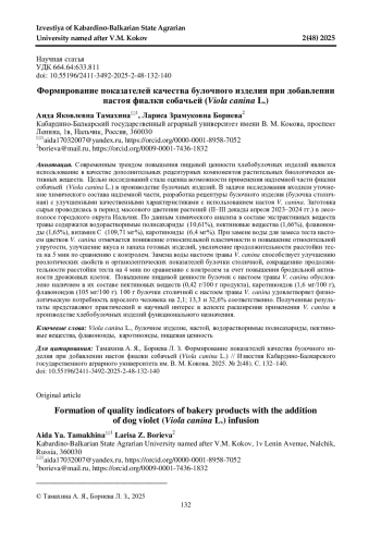 Современным трендом повышения пищевой ценности хлебобулочных изделий является использование в качестве дополнительных рецептурных компонентов растительных биологически активных веществ. Целью исследований стала оценка возможности применения надземной части фиалки собачьей ( Viola canina L.) в производстве булочных изделий. В задачи исследования входили уточнение химического состава надземной части, разработка рецептуры булочного изделия (булочка столичная) с улучшенными качественными характеристиками с использованием настоя V. canina. Заготовка сырья проводилась в период массового цветения растений (II-III декады апреля 2023-2024 гг.) в лесополосе городского округа Нальчик. По данным химического анализа в составе экстрактивных веществ травы содержатся водорастворимые полисахариды (10,61%), пектиновые вещества (1,66%), флавоноиды (1,65%), витамин С (109,71 мг%), каротиноиды (6,4 мг%). При замене воды для замеса теста настоем цветков V. canina отмечается понижение относительной пластичности и повышение относительной упругости, улучшение вкуса и запаха готовых изделий, увеличение продолжительности расстойки теста на 5 мин по сравнению с контролем. Замена воды настоем травы V. canina способствует улучшению реологических свойств и органолептических показателей булочки столичной, сокращению продолжительности расстойки теста на 4 мин по сравнению с контролем за счет повышения бродильной активности дрожжевых клеток. Повышение пищевой ценности булочек с настоем травы V. canina обусловлено наличием в их составе пектиновых веществ (0,42 г/100 г продукта), каротиноидов (1,6 мг/100 г), флавоноидов (105 мг/100 г). 100 г булочки столичной с настоем травы V. canina удовлетворяет физиологическую потребность взрослого человека на 2,1; 13,3 и 32,6% соответственно. Полученные результаты представляют практический и научный интерес в аспекте расширения применения V. canina в производстве хлебобулочных изделий функционального назначения.