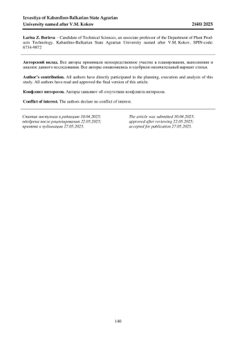 Данная работа посвящена определению изменения аминокислотного состава среды спиртового сусла, осахаренного солодом и поверхностной культурой плесени, до и после пастеризации. Исследования проводились в ООО «Премиум» и на кафедре «Технология производства и переработки сельскохозяйственной продукции» Кабардино-Балкарского ГАУ в 2023-2024 гг. В качестве объектов исследований служили осахаренное сусло до и после пастеризации, бражка, пшеничный солод, культура Aspergillus oryzae. Исследовали кукурузное сусло, осахаренное в первом варианте смесью солодов (ячмень 35, овес 35, просо 30%); во втором - поверхностной культурой плесени Aspergillus oryzae. Установлено, что пастеризация сусла, осахаренного различными агентами, сказывается в большей степени на среде, осахаренной поверхностной культурой плесени Aspergillus oryzae. В этом случае при пастеризации теряется 26,5% аминокислот, в то время как в осахаренном солодом сусле 14,2%. Тенденция к убыли наблюдается у всех шести кислот, за исключением L-лейцина, содержание которого в пастеризованном сусле, осахаренном культурой плесневого гриба, тоже несколько ниже, чем в пробе с пастеризованным суслом. Определено, что при пастеризации среды аминокислотный состав ее существенно не изменяется, однако температурному воздействию больше подвергаются аминокислоты в сусле, осахаренном поверхностной культурой плесневых грибов Aspergillus oryzae. Общее содержание аминокислот в крахмалсодержащих средах, осахаренных солодом и поверхностной культурой плесени, после пастеризации примерно одинаково и достаточно для обеспечения аминным азотом дрожжегенерацию и брожение.