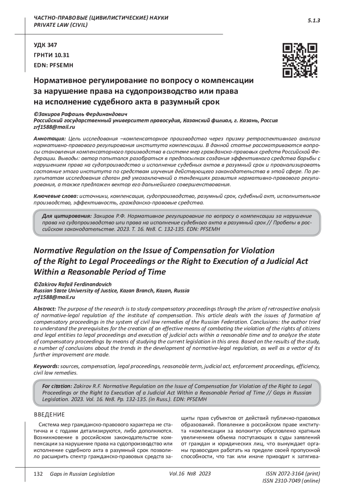 1. Симонов И.Д. Производство по делам о присуждении компенсации за нарушение права на судопроизводство в разумный срок или права на исполнение судебного акта в разумный срок: дис. … канд. юрид. наук. Саратов, 2015. 252 с. EDN: ZPRBHJ