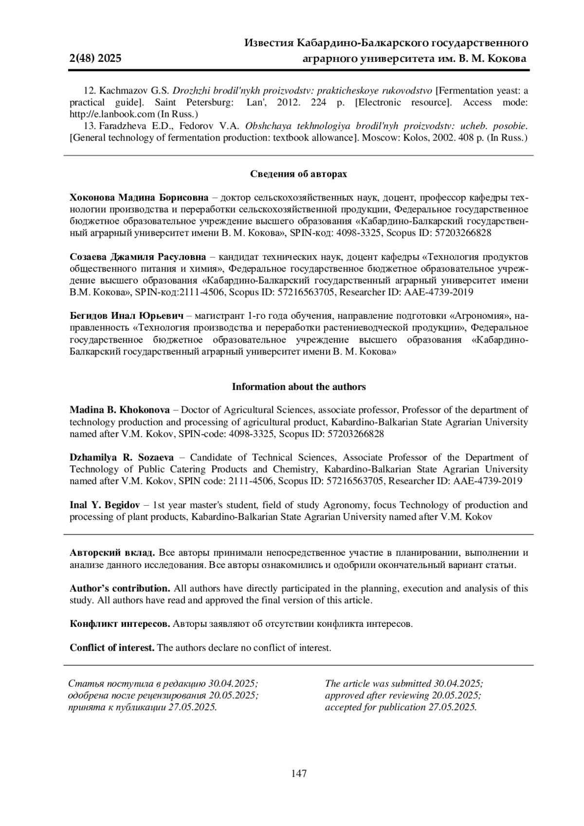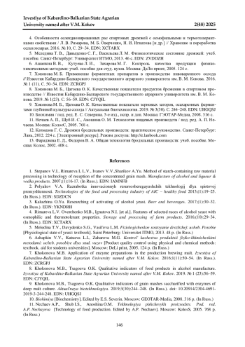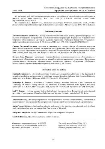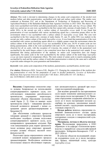 ХОКОНОВА М. Б., СОЗАЕВА Д. Р., БЕГИДОВ И. Ю. ИЗМЕНЕНИЕ СОСТАВА СРЕДЫ ПРИ ПАСТЕРИЗАЦИИ СУСЛА ДЛЯ ПРИГОТОВЛЕНИЯ ДРОЖЖЕЙ В СПИРТОВОМ ПРОИЗВОДСТВЕ // ИЗВЕСТИЯ КАБАРДИНО-БАЛКАРСКОГО ГОСУДАРСТВЕННОГО АГРАРНОГО УНИВЕРСИТЕТА ИМ. В. М. КОКОВА. 2025. № 2 (48)