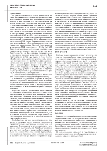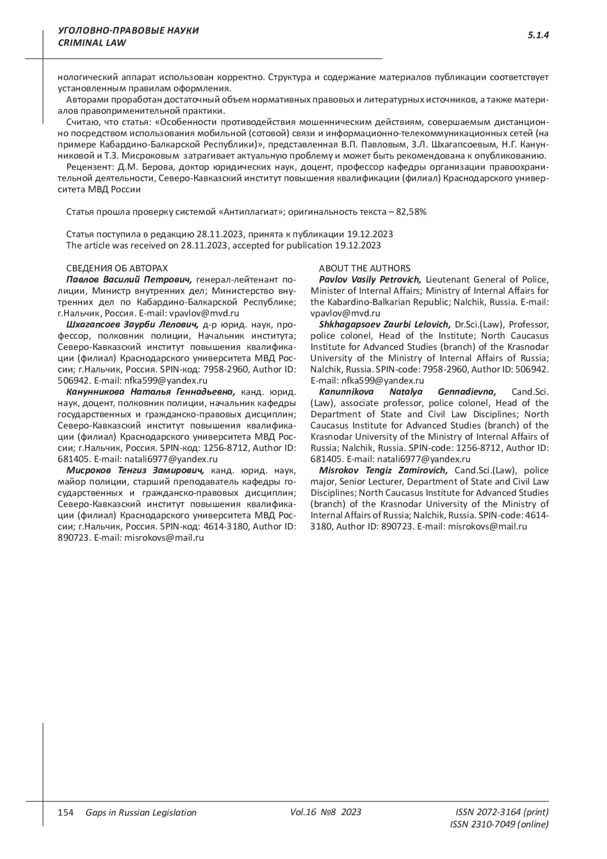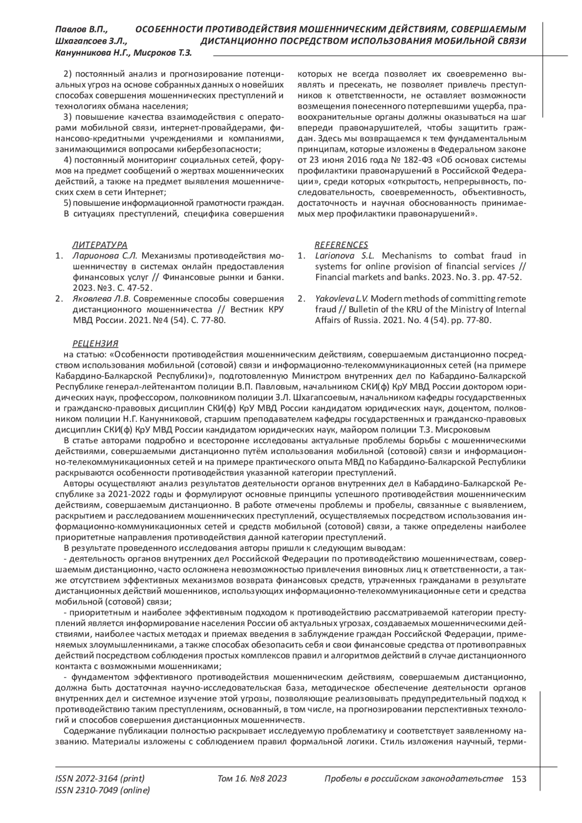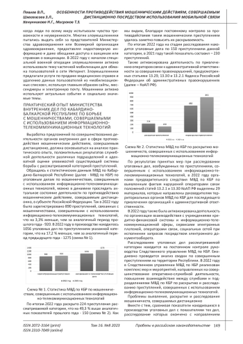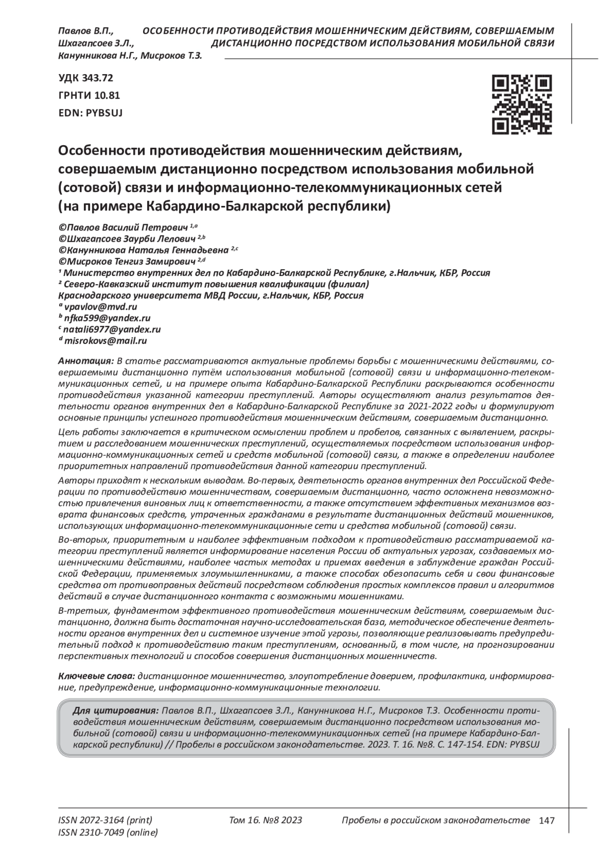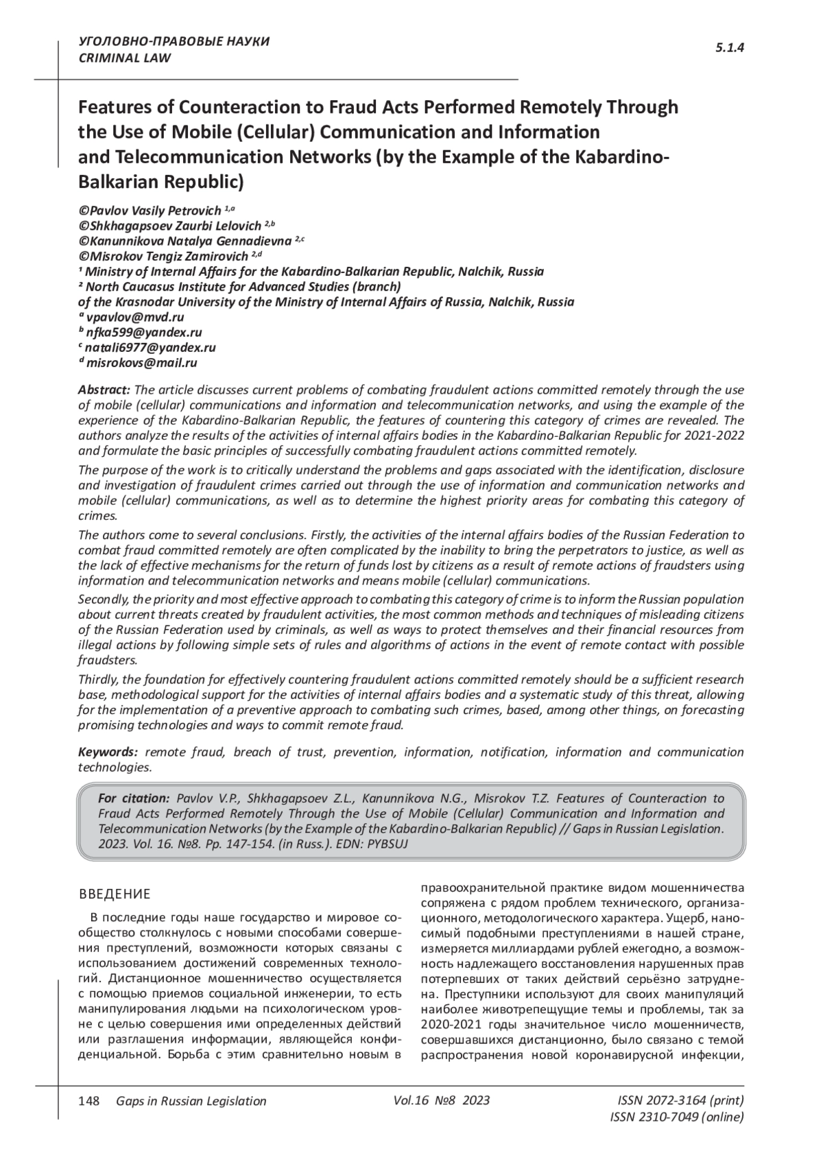 ПАВЛОВ В. П., ШХАГАПСОЕВ З. Л., КАНУННИКОВА Н. Г., МИСРОКОВ Т. З. ОСОБЕННОСТИ ПРОТИВОДЕЙСТВИЯ МОШЕННИЧЕСКИМ ДЕЙСТВИЯМ, СОВЕРШАЕМЫМ ДИСТАНЦИОННО ПОСРЕДСТВОМ ИСПОЛЬЗОВАНИЯ МОБИЛЬНОЙ (СОТОВОЙ) СВЯЗИ И ИНФОРМАЦИОННО-ТЕЛЕКОММУНИКАЦИОННЫХ СЕТЕЙ (НА ПРИМЕРЕ КАБАРДИНО-БАЛКАРСКОЙ РЕСПУБЛИКИ) // ПРОБЕЛЫ В РОССИЙСКОМ ЗАКОНОДАТЕЛЬСТВЕ. 2023. Т. 16 № 8 (36 СТ.)