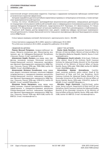 Статья: ОСОБЕННОСТИ ПРОТИВОДЕЙСТВИЯ МОШЕННИЧЕСКИМ ДЕЙСТВИЯМ, СОВЕРШАЕМЫМ ДИСТАНЦИОННО ПОСРЕДСТВОМ ИСПОЛЬЗОВАНИЯ МОБИЛЬНОЙ (СОТОВОЙ) СВЯЗИ И ИНФОРМАЦИОННО-ТЕЛЕКОММУНИКАЦИОННЫХ СЕТЕЙ (НА ПРИМЕРЕ КАБАРДИНО-БАЛКАРСКОЙ РЕСПУБЛИКИ) (2023)