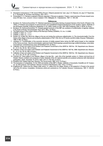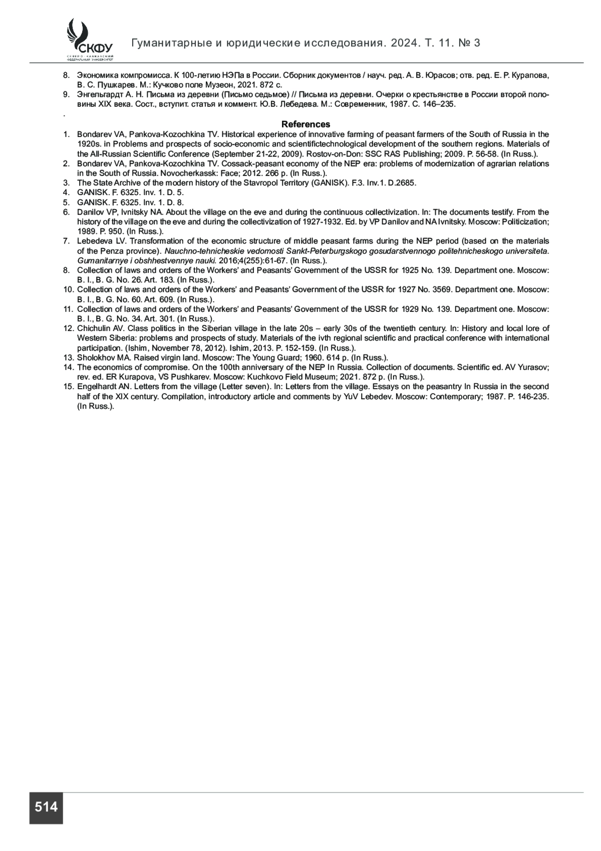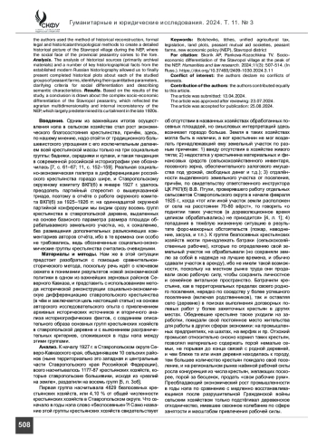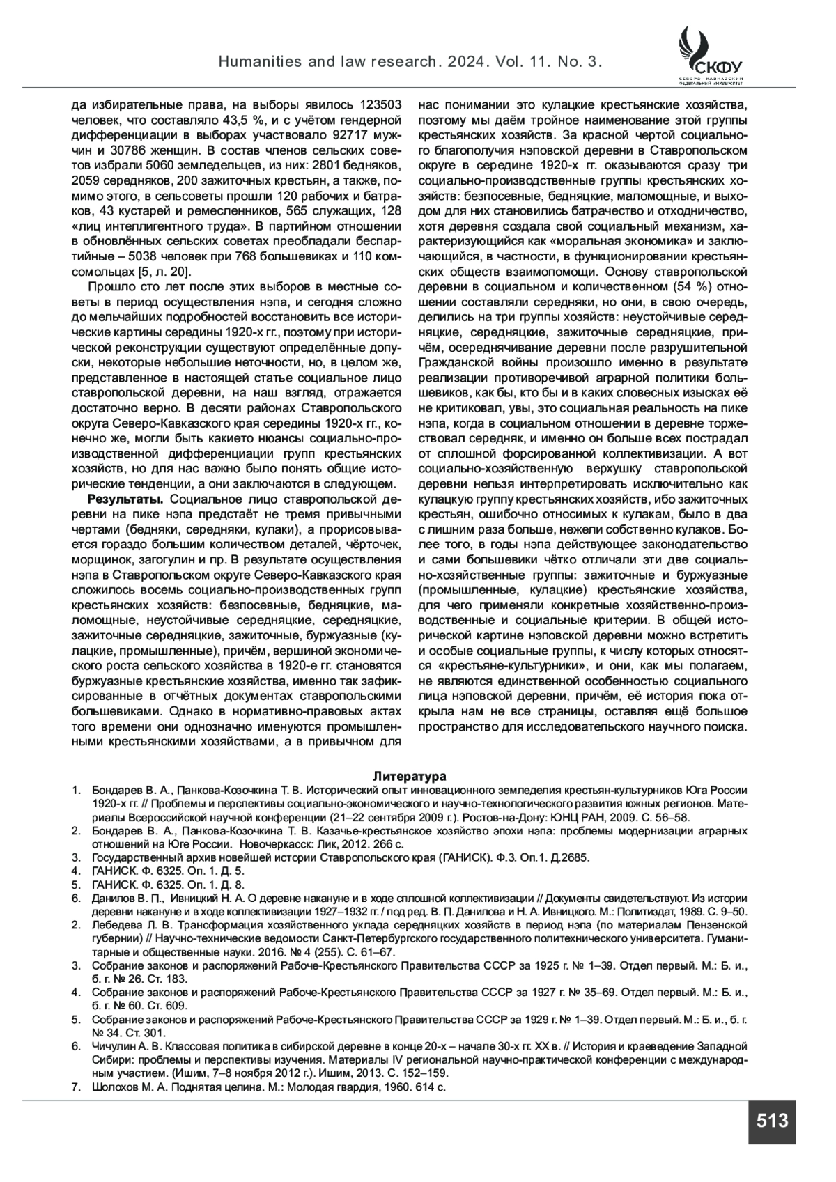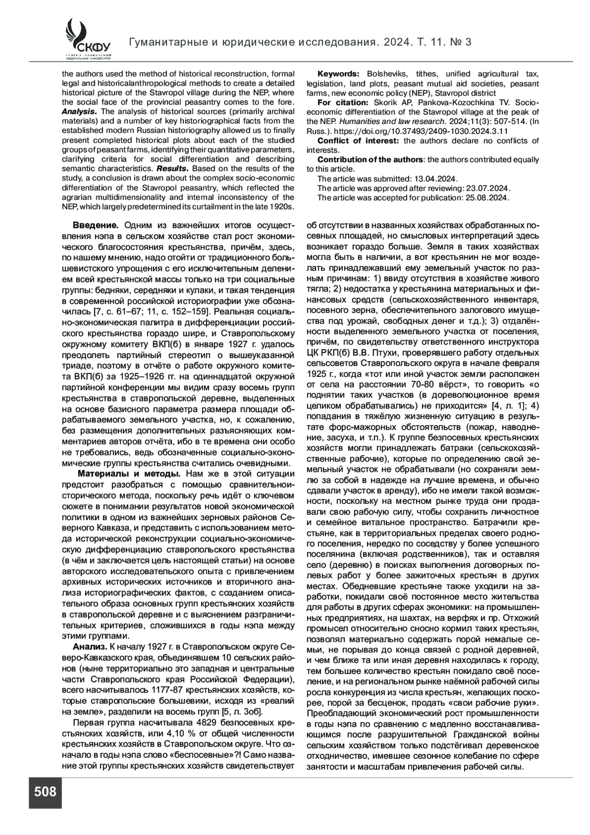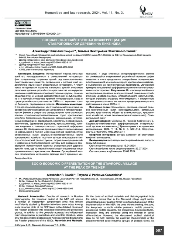 СКОРИК А. П., ПАНКОВА-КОЗОЧКИНА Т. В. СОЦИАЛЬНО-ХОЗЯЙСТВЕННАЯ ДИФФЕРЕНЦИАЦИЯ СТАВРОПОЛЬСКОЙ ДЕРЕВНИ НА ПИКЕ НЭПА // ГУМАНИТАРНЫЕ И ЮРИДИЧЕСКИЕ ИССЛЕДОВАНИЯ. 2024. ТОМ 11, № 3