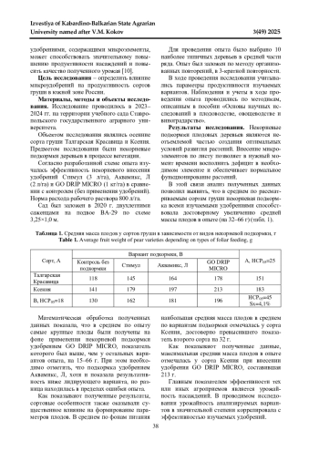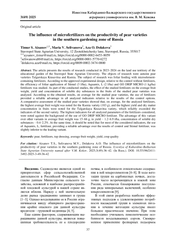 В статье приведены результаты исследования, проведенного в 2023-2024 гг. на территории учебного сада Ставропольского государственного аграрного университета. Объектами исследования являлись осенние сорта груши Талгарская Красавица и Ксения. Предметом исследования были некорневые подкормки - удобрения, содержащие микроэлементы. Согласно разработанной схеме опыта изучалась эффективность фолиарного внесения удобрений Стимул (3 л/га), Аквамикс, Л (2 л/га) и GO DRIP MICRO (1 кг/га) в сравнении с контролем без удобрений. В рамках проводимого исследования анализировалось воздействие удобрений на среднюю массу плодов, урожайность и концентрацию растворимых сухих веществ в плодах изучаемых сортов груши. Согласно полученным результатам, удобрения обеспечивали достоверное преимущество по всем анализируемым показателям относительно контрольных вариантов. Сравнительная оценка изучаемых сортов груши показала, что наиболее высокая средняя масса плодов отмечалась у сорта Ксения (183 г), а наибольшие урожайность и концентрация сухих веществ были в плодах сорта Талгарская Красавица с достоверным превышением показателей второго сорта. Самые высокие показатели по всем анализируемым параметрам были получены на фоне применения удобрения GO DRIP MICRO. Преимущество данного варианта относительно остальных в средней массе плодов составило 15-66 г, в урожайности 1,2-6,9 т/га, концентрации растворимых сухих веществ 0,4-2,2%. При этом необходимо отметить, что по большинству рассматриваемых показателей удобрение Аквамикс, Л, несмотря на достоверное преимущество относительно вариантов контроля и удобрения Стимул, несущественно уступало лидирующему варианту.