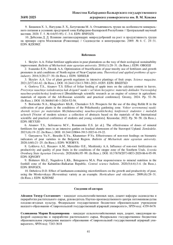 7. Гурьянова Ю. В., Беседин Е. Ю., Хатунцев П. Ю. Эффективность некорневых подкормок на биометрические показатели сортов груши в условиях Белгородской области // Вестник Мичуринского государственного аграрного университета. 2020. № 1(60). С. 21-25. EDN: WZOBYS