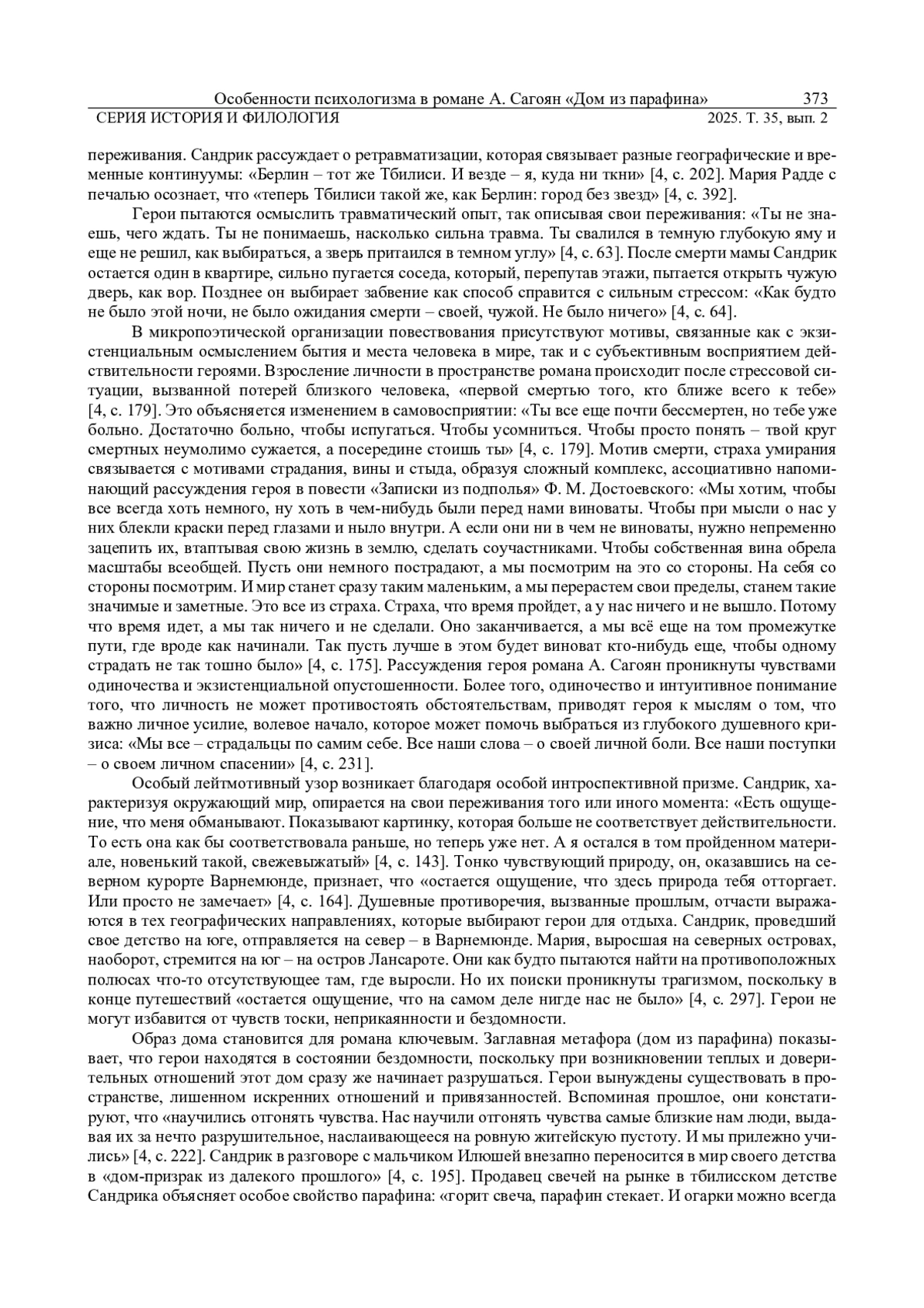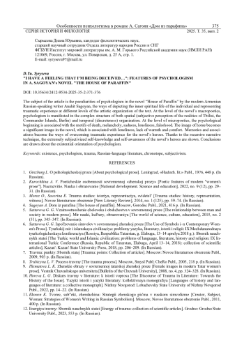 СЫРЫСЕВА Д. Ю. «ЕСТЬ ОЩУЩЕНИЕ, ЧТО МЕНЯ ОБМАНЫВАЮТ...»: ОСОБЕННОСТИ ПСИХОЛОГИЗМА В РОМАНЕ А. САГОЯН «ДОМ ИЗ ПАРАФИНА» // ВЕСТНИК УДМУРТСКОГО УНИВЕРСИТЕТА. СЕРИЯ: ИСТОРИЯ И ФИЛОЛОГИЯ. 2025. Т. 35 № 2