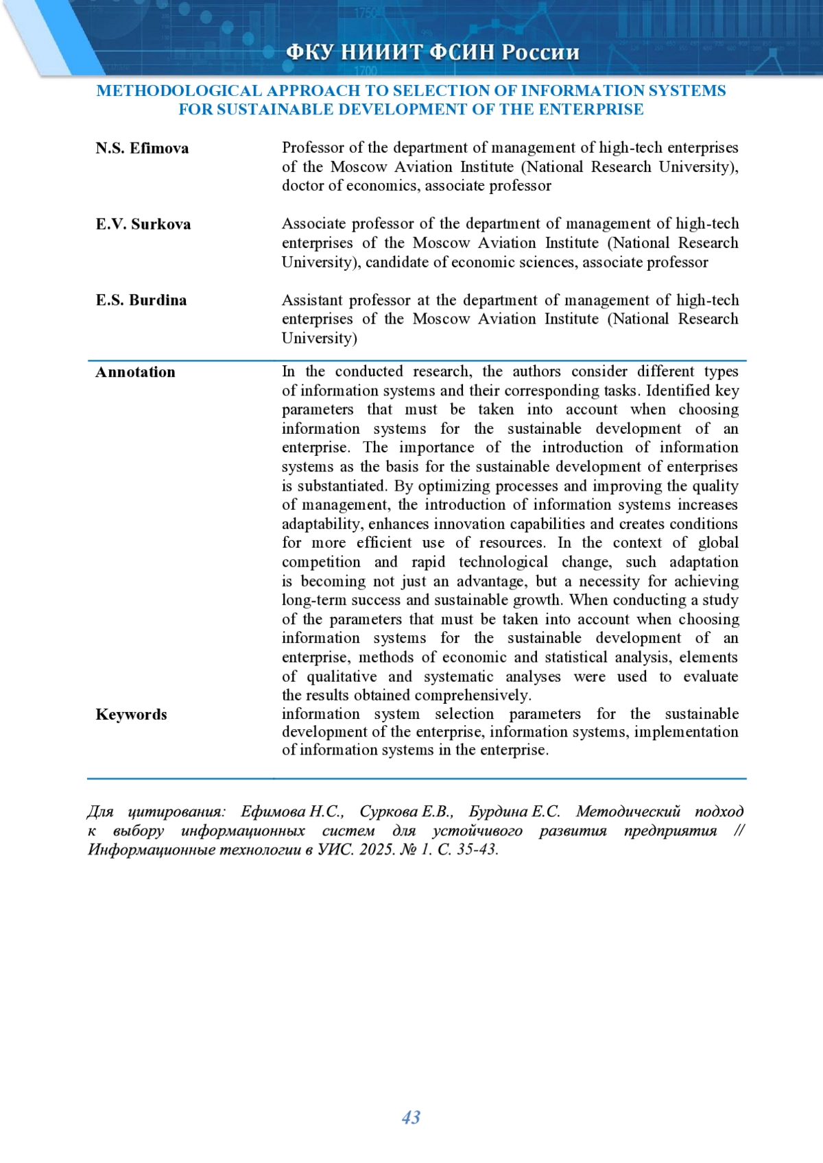 ЕФИМОВА Н. С., СУРКОВА Е. В., БУРДИНА Е. С. МЕТОДИЧЕСКИЙ ПОДХОД К ВЫБОРУ ИНФОРМАЦИОННЫХ СИСТЕМ ДЛЯ УСТОЙЧИВОГО РАЗВИТИЯ ПРЕДПРИЯТИЯ // ИНФОРМАЦИОННЫЕ ТЕХНОЛОГИИ В УИС. 2025. № 1