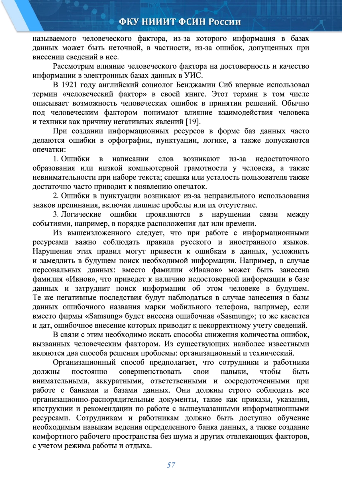Статья посвящена анализу и оценке влияния человеческого фактора на качество формирования электронных банков данных в формате ИСУБД «CronosPRO». Рассмотрены такие понятия, как «человеческий фактор», «качество данных», «банк и база данных». Также в качестве примера приведены варианты некорректного заполнения различных сведений, предназначенных для формирования банка данных: опечатки, орфографические, пунктуационные и логические ошибки. Предложены способы решения данной проблемы. Кроме того, в статье в качестве примера приведено программное средство, в котором реализован алгоритм проверки сведений в формате «Excel», предназначенных для занесения в формируемый централизованный банк данных в формате ИСУБД «CronosPRO». Рассмотренное программное средство позволяет в автоматическом режиме определить наличие ошибок в таблице «Excel», планируемой к конвертированию в формат ИСУБД «CronosPRO», возможность вывести их на экран или выгрузить в файл. Внедрение рассмотренного программного средства позволило минимизировать количество ошибочных записей в ежемесячно формируемых централизованных банках данных путем проверки и исправления ошибок на стадии их формирования и, как следствие, минимизировать влияние человеческого фактора на качество данных в информационных ресурсах УИС.
