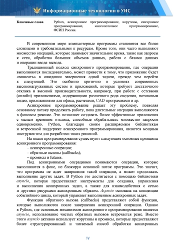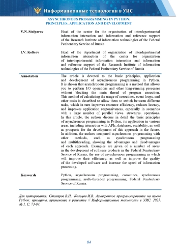 Статья посвящена основным принципам, применению и развитию асинхронного программирования на языке Python. Показано, что асинхронное программирование - это способ, позволяющий выполнять операции ввода-вывода и другие длительные процессы без блокировки основного потока выполнения программы. Описано, что указанный способ достигается за счет использования корутин, событийных циклов и других механизмов, позволяющих программе переключаться между разными задачами, что, в свою очередь, повышает эффективность использования ресурсов, снижает время ожидания и улучшает отзывчивость приложений, особенно в сценариях, связанных с большим количеством параллельных операций. В данной статье авторами подробно рассматриваются основные принципы асинхронного программирования на языке Python, его применение в различных сферах, включая взаимодействие с API, базами данных, возможности масштабируемости, а также перспективы развития данного подхода в будущем. Проведено сравнение асинхронного программирования с другими способами, такими, как синхронное программирование и многопоточность, показаны преимущества и недостатки каждого подхода. Приведены примеры ряда направлений разработки программных продуктов в ФСИН России, применение асинхронного программирования в которых позволит улучшить их эффективность, а также повысит качество разработанных программных средств и увеличит скорость обработки информации.