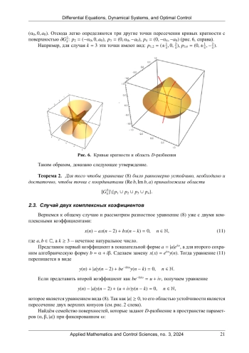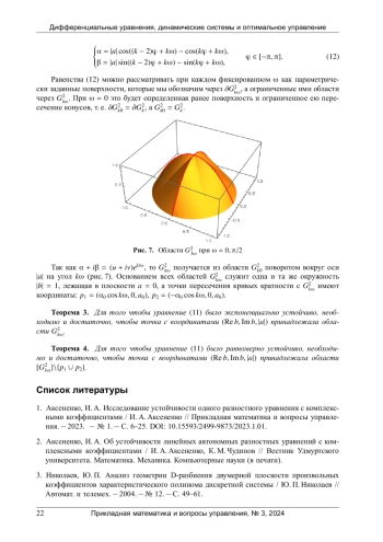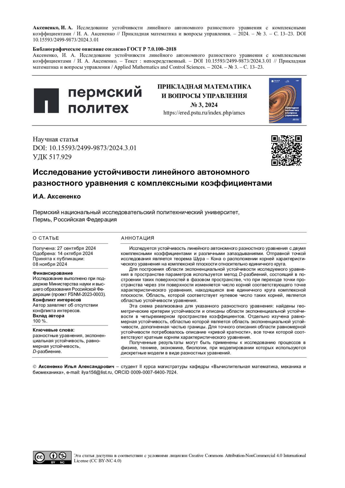 1. Аксененко, И. А. Исследование устойчивости одного разностного уравнения с комплексными коэффициентами / И. А. Аксененко // Прикладная математика и вопросы управления. - 2023. - № 1. - С. 6-25. DOI: 10.15593/2499-9873/2023.1.01 EDN: MVDEVM