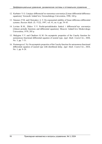 16. Постаногова, И. Ю. Об асимптотических свойствах функции Коши автономного функционально-дифференциального уравнения нейтрального типа с распределённым запаздыванием / И. Ю. Постаногова // Прикладная математика и вопросы управления. - 2024. - № 1. - С. 8-28. EDN: DNTPIC