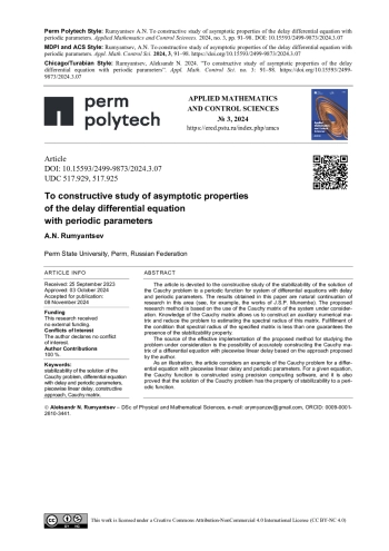 5. Rumyantsev, A. N. On exact construction of the Cauchy function for a differential equation with linear delay / A. N.Rumyantsev // Functional Differential Equations. - 2021. - Vol. 28, no 1-2. - P. 11-17.