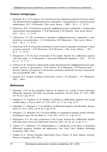 1. Мунембе, Ж. С. П. К вопросу об асимптотическом поведении решений системы линейных функционально-дифференциальных уравнений с запаздыванием и периодическими параметрами / Ж. С. П. Мунембе // Изв. вузов. Матем. - 2000. - №. 4. - С. 28-35. EDN: HQVJRJ