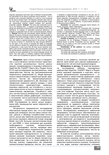 Материалы и методы. В качестве материала исследования избраны порожденные названными выше нейросетями языковые выражения и короткие тексты разной функциональной принадлежности – от предложения и семантической дефиниции слова до текста-обоснования собственного ответа нейросети. В качестве основных использовались метод макроструктурного анализа, метод лексико-семантического анализа, метод грамматического анализа, метод стилистического анализа, метод семантико-прагматического анализа.