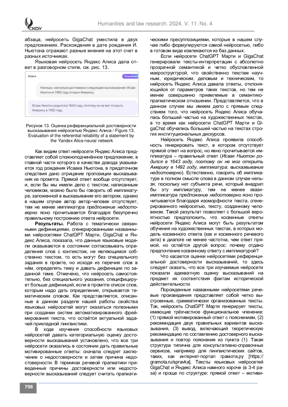 Введение. Цель статьи состоит в определении и сопоставлении лингвистических характеристик коротких русскоязычных текстов разных жанров, сгенерированных в языковых нейросетях GigaChat, ChatGPT Марти и Яндекс Алиса. Актуальность исследования состоит в том, что изучение лингвистических характеристик сгенерированных текстов позволило сделать выводы о таких характеристиках названных языковых нейросетей, как способность к построению микротестов по заданным в промпте семантическим параметрам, способность избирать контекстуально релевантные значения слов в тематическом наборе дефиниций, способность к построению текста критической интерпретации высказывания.