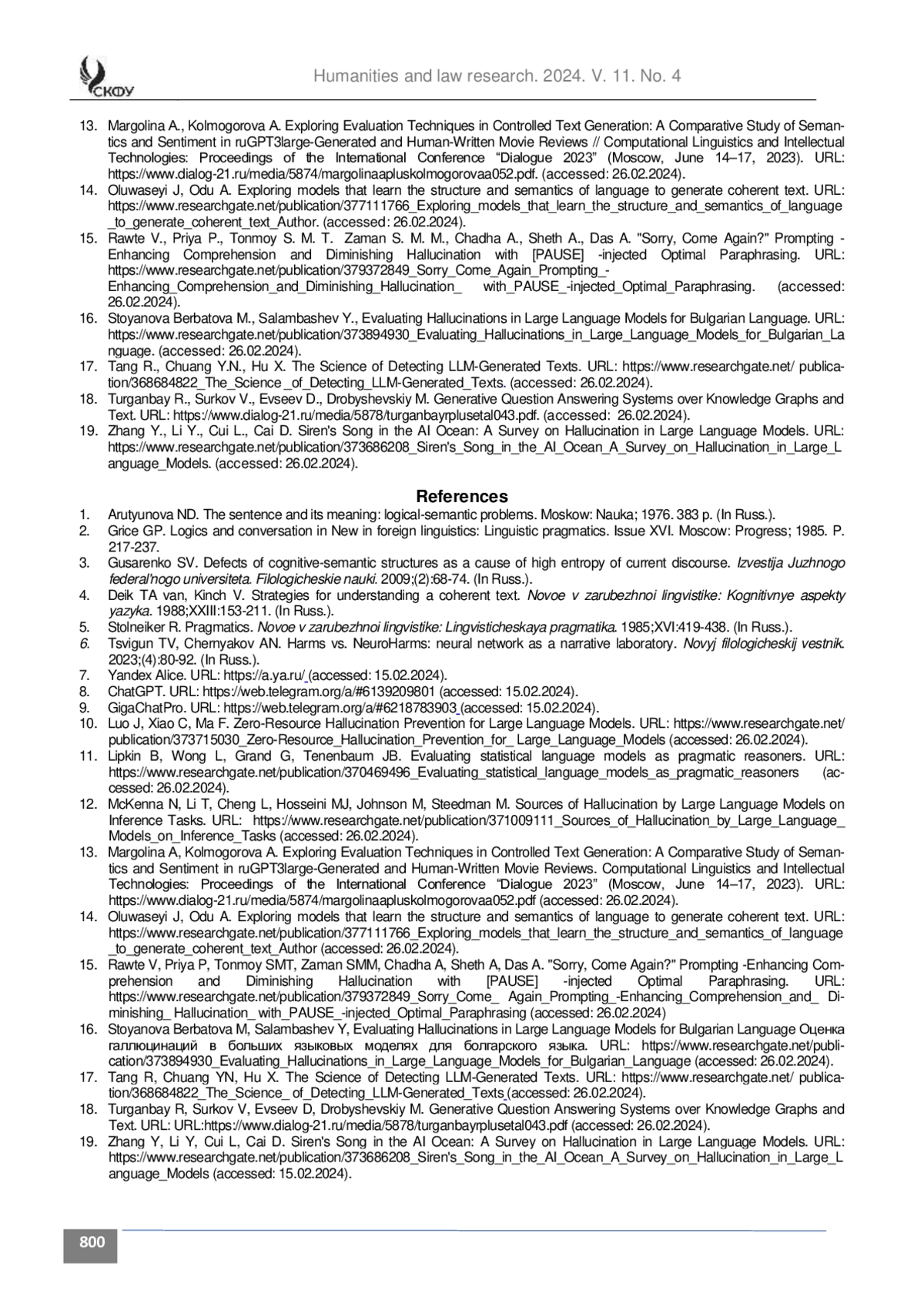 19. Zhang Y., Li Y., Cui L., Cai D. Siren’s Song in the AI Ocean: A Survey on Hallucination in Large Language Models. URL: https://www.researchgate.net/publication/373686208_Siren’s_Song_in_the_AI_Ocean_A_Survey_on_Hallucination_in_Large_Language_Models. (accessed: 26.02.2024).