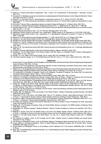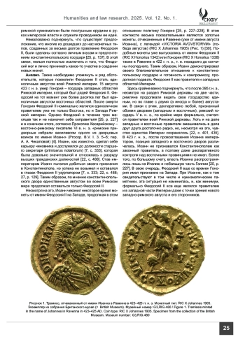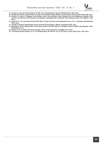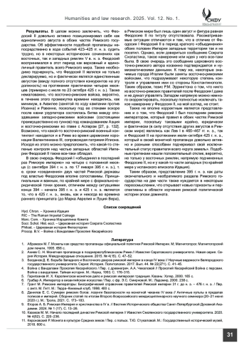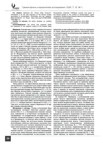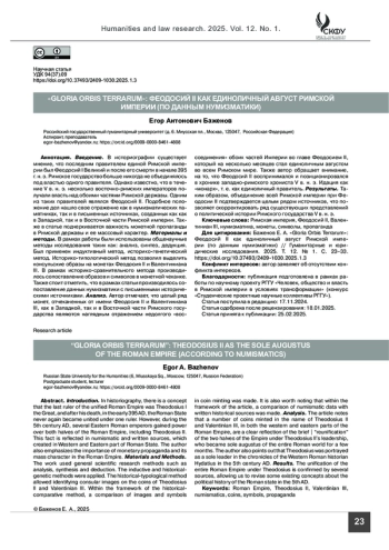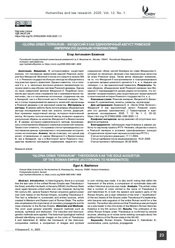 БАЖЕНОВ Е. А. «GLORIA ORBIS TERRARUM»: ФЕОДОСИЙ II КАК ЕДИНОЛИЧНЫЙ АВГУСТ РИМСКОЙ ИМПЕРИИ (ПО ДАННЫМ НУМИЗМАТИКИ) // ГУМАНИТАРНЫЕ И ЮРИДИЧЕСКИЕ ИССЛЕДОВАНИЯ. 2025. ТОМ 12, № 1