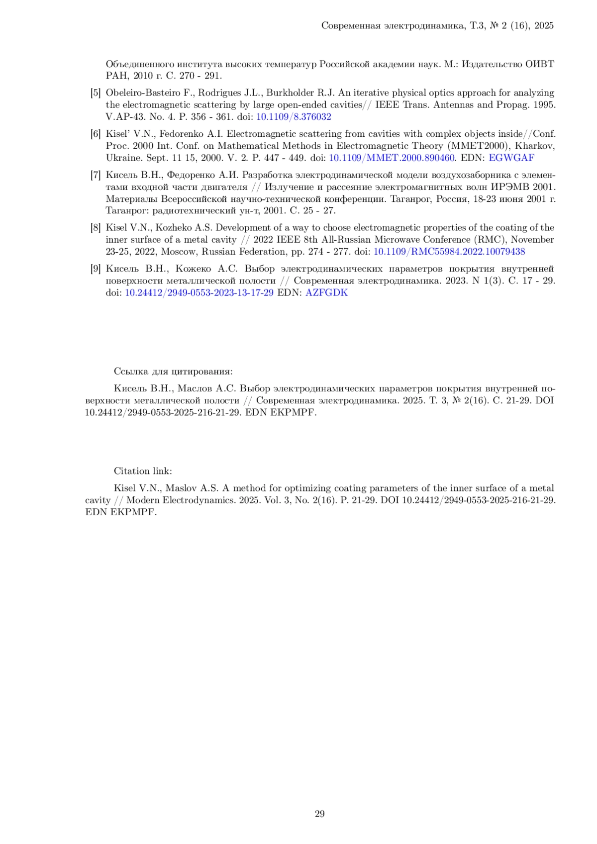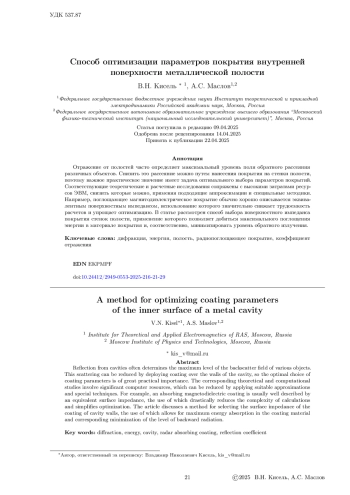 МАСЛОВ А. С., КИСЕЛЬ В.Н. СПОСОБ ОПТИМИЗАЦИИ ПАРАМЕТРОВ ПОКРЫТИЯ ВНУТРЕННЕЙ ПОВЕРХНОСТИ МЕТАЛЛИЧЕСКОЙ ПОЛОСТИ // СОВРЕМЕННАЯ ЭЛЕКТРОДИНАМИКА. 2025. № 2 (16), ТОМ 3