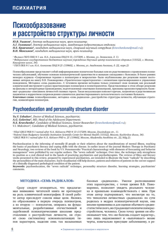 Ключевые фразы: психообразование, методика «семь радикалов», расстройство структуры личности, обучающие страте- гии, комментарии психиатров