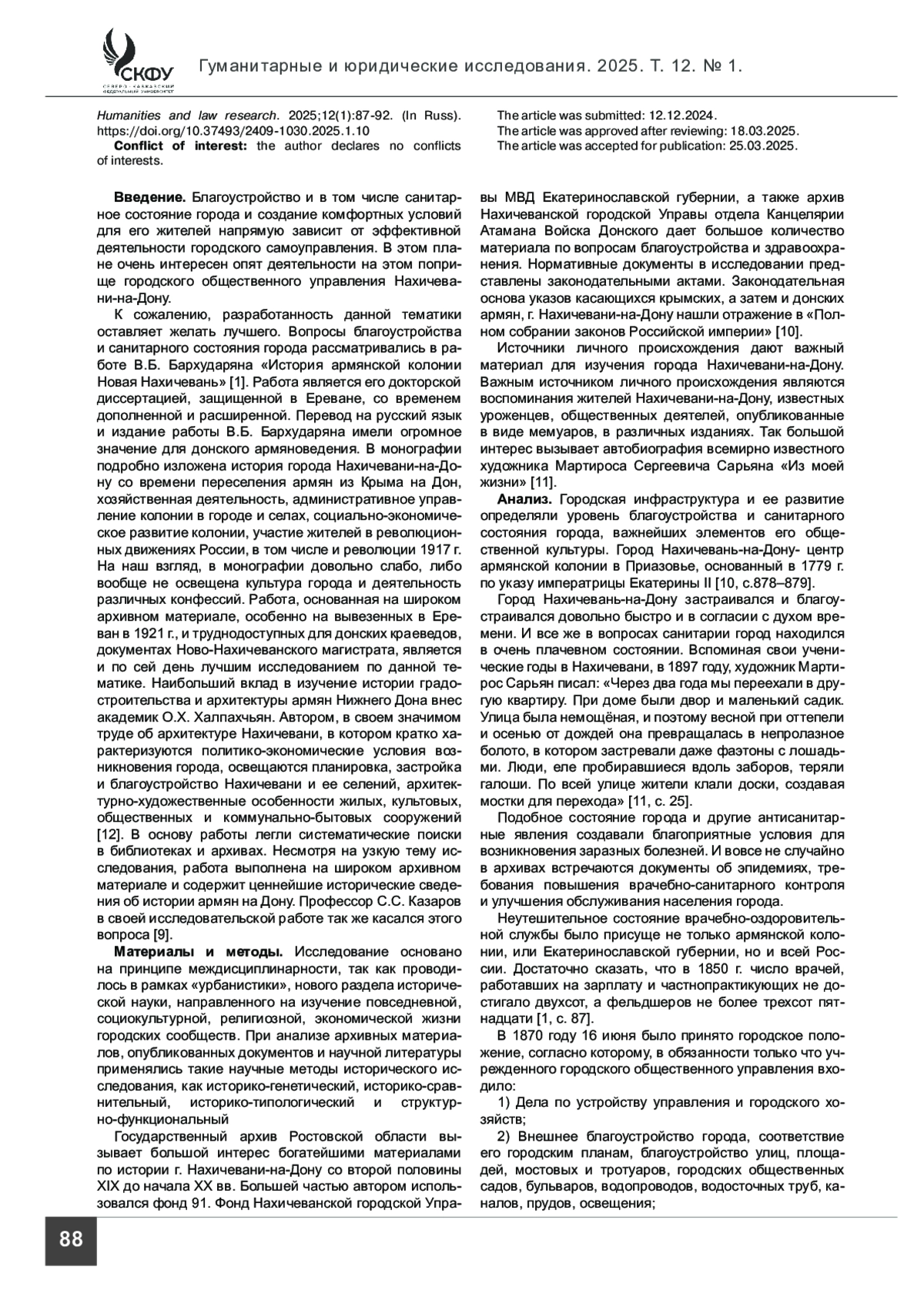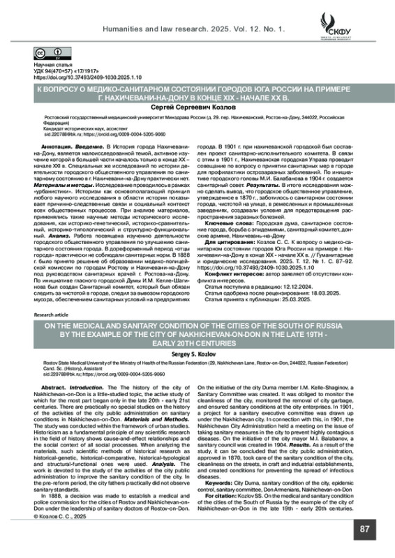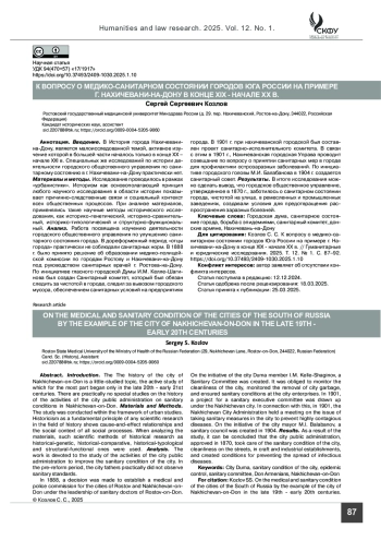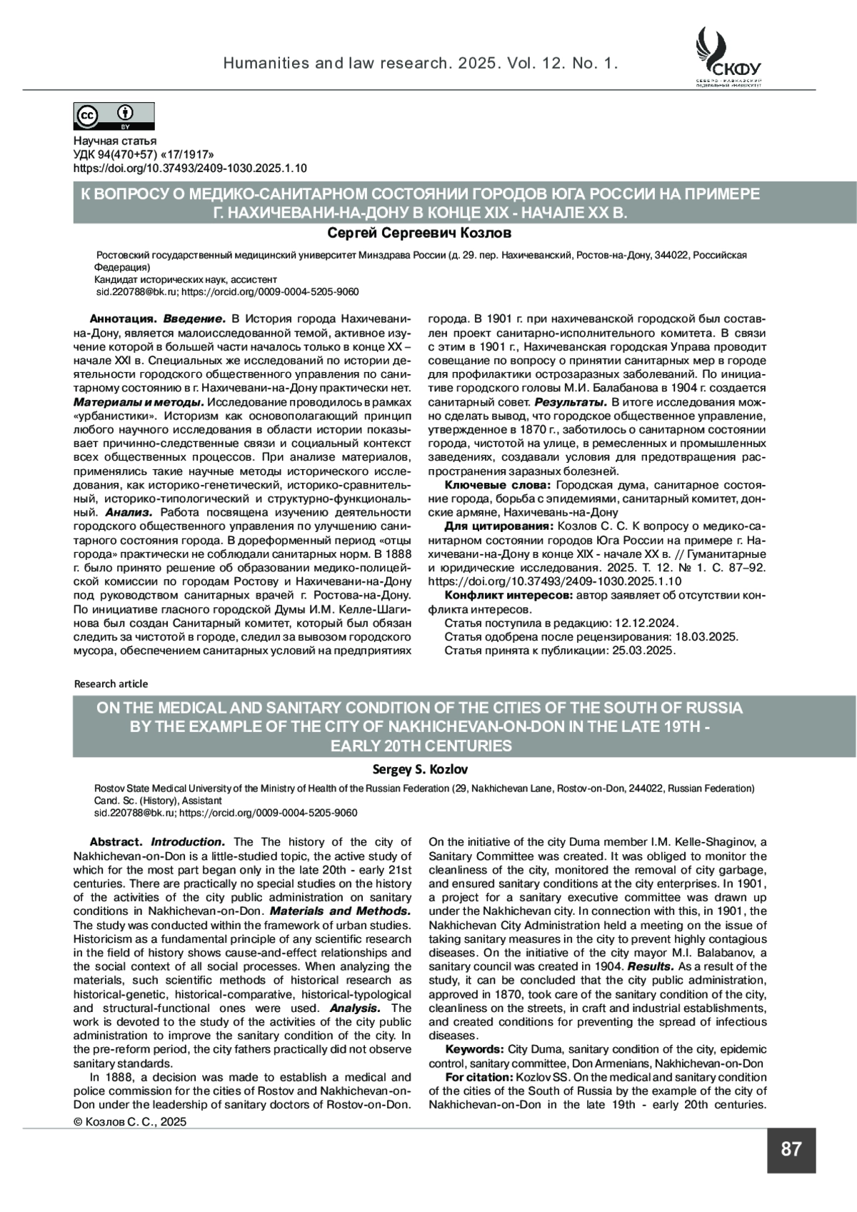 КОЗЛОВ С. С. К ВОПРОСУ О МЕДИКО-САНИТАРНОМ СОСТОЯНИИ ГОРОДОВ ЮГА РОССИИ НА ПРИМЕРЕ Г. НАХИЧЕВАНИ-НА-ДОНУ В КОНЦЕ XIX – НАЧАЛЕ ХХ ВВ. // ГУМАНИТАРНЫЕ И ЮРИДИЧЕСКИЕ ИССЛЕДОВАНИЯ. 2025. ТОМ 12, № 1