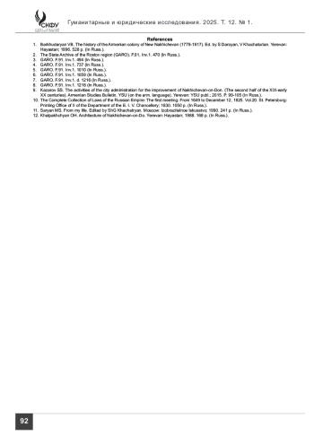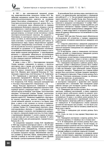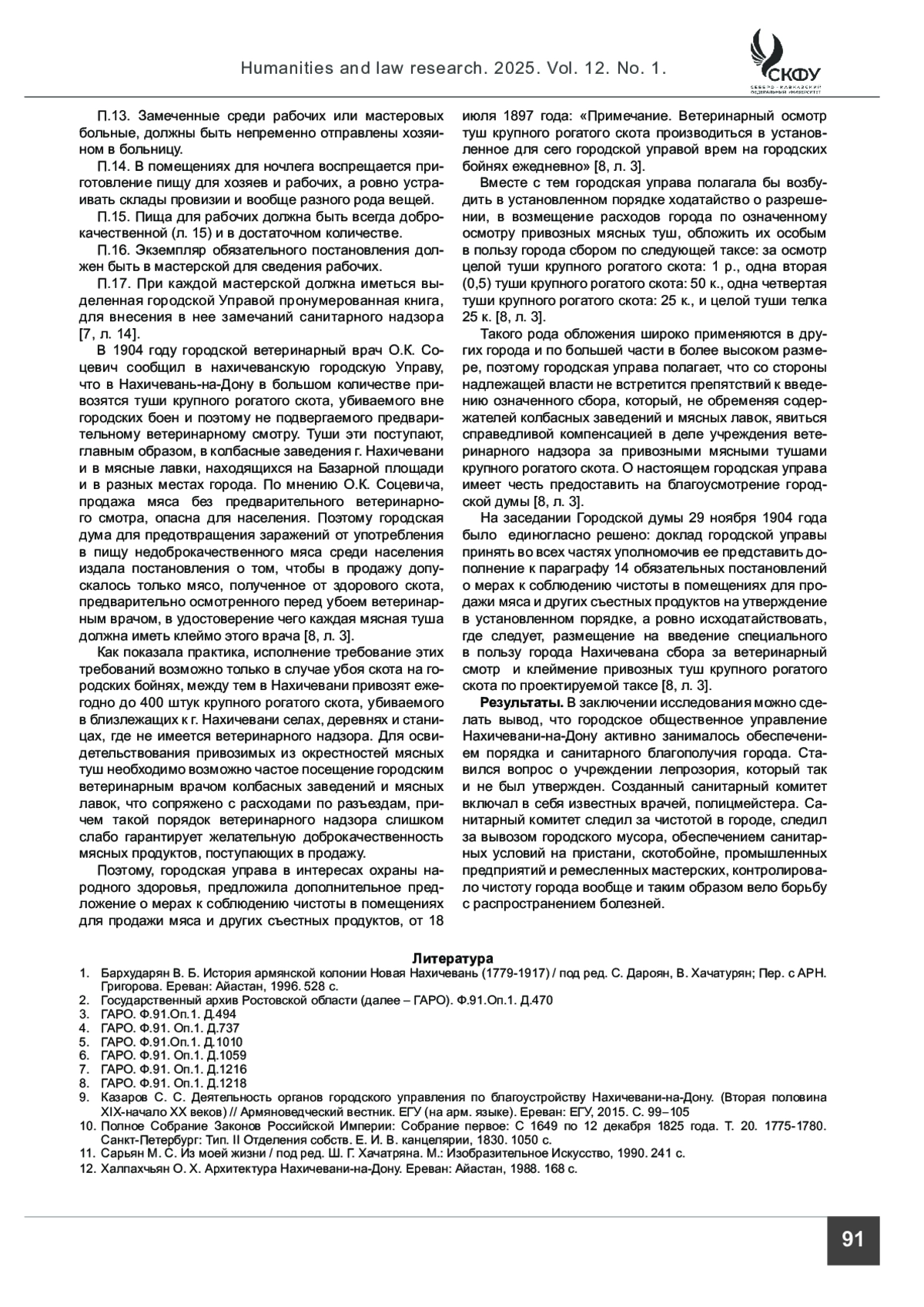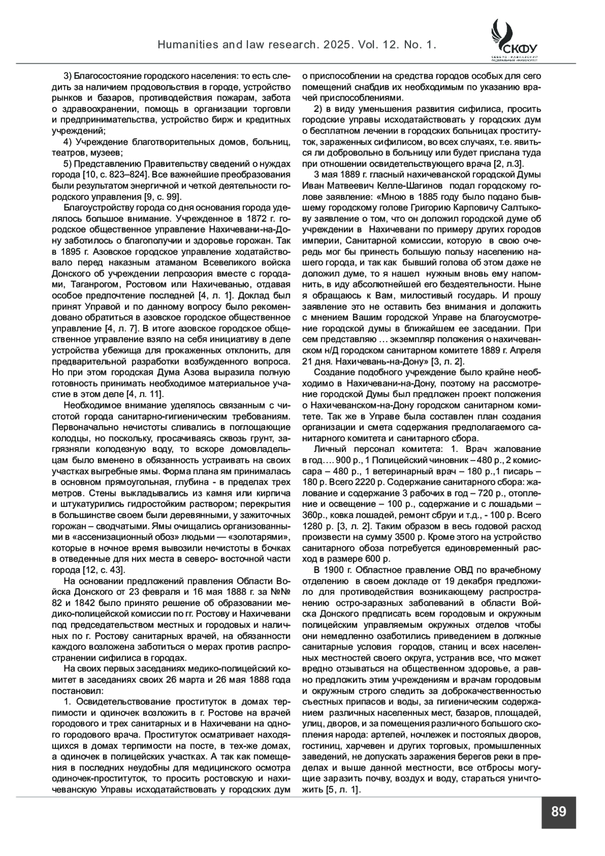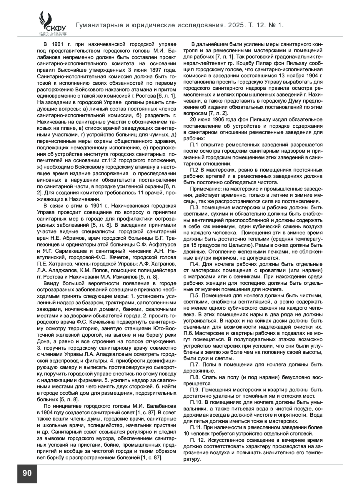 КОЗЛОВ С. С. К ВОПРОСУ О МЕДИКО-САНИТАРНОМ СОСТОЯНИИ ГОРОДОВ ЮГА РОССИИ НА ПРИМЕРЕ Г. НАХИЧЕВАНИ-НА-ДОНУ В КОНЦЕ XIX – НАЧАЛЕ ХХ ВВ. // ГУМАНИТАРНЫЕ И ЮРИДИЧЕСКИЕ ИССЛЕДОВАНИЯ. 2025. ТОМ 12, № 1