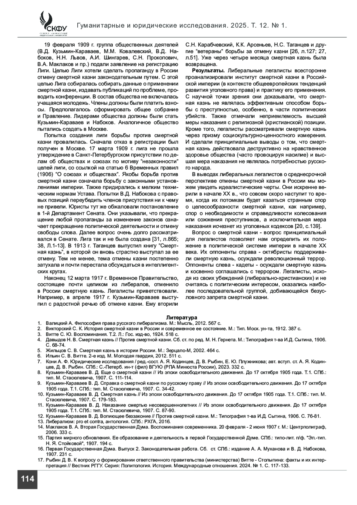 РЫБИН Д. В. ПРАВО НА ЖИЗНЬ И СМЕРТНАЯ КАЗНЬ В РОССИЙСКОЙ ИМПЕРИИ В ВОЗЗРЕНИЯХ ЛИБЕРАЛЬНЫХ ЛЕГАЛИСТОВ НА РУБЕЖЕ ХIХ – ХХ ВЕКОВ // ГУМАНИТАРНЫЕ И ЮРИДИЧЕСКИЕ ИССЛЕДОВАНИЯ. 2025. ТОМ 12, № 1