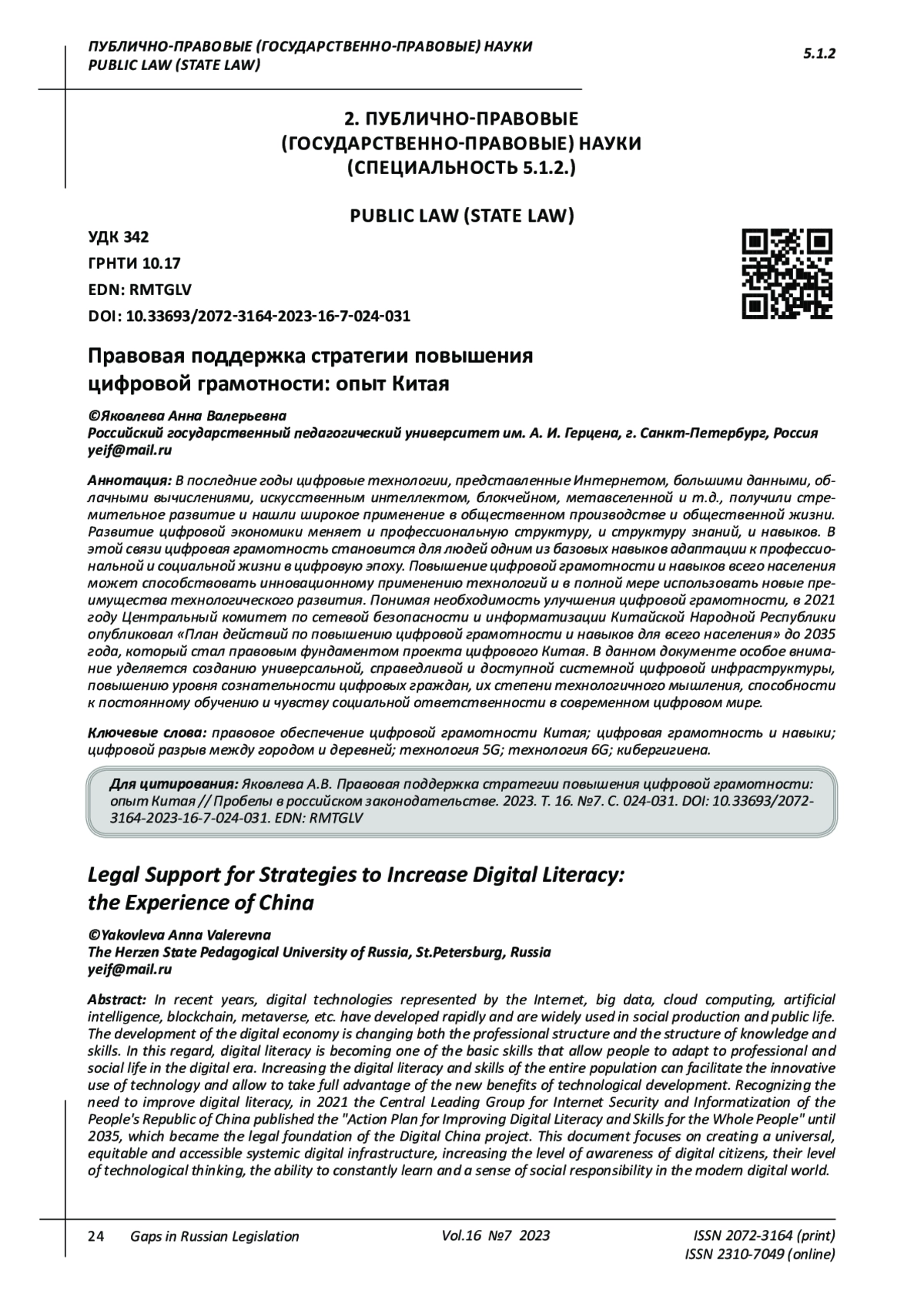 Yakovleva A.V. Legal foundations of ensuring cyber security in China / A.V. Yakovleva // Information law. - 2021. - № 2. - pp. 37-40. -. DOI: 10.18572/1999-480X-2021-2-37-40 EDN: NCYMDX