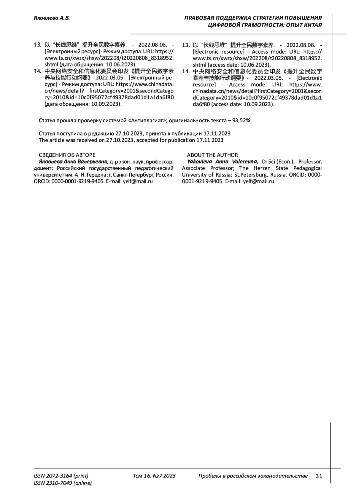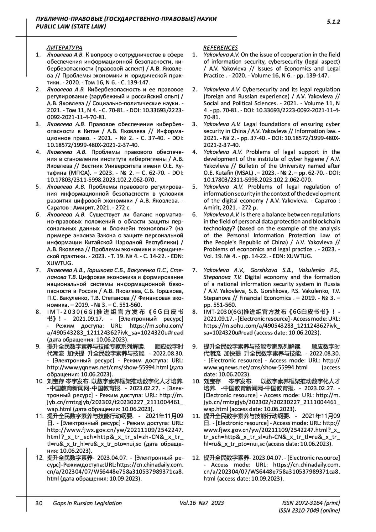 3. Яковлева А.В. Правовое обеспечение кибербезопасности в Китае / А.В. Яковлева // Информационное право. - 2021. - № 2. - С. 37-40. -. DOI: 10.18572/1999-480X-2021-2-37-40 EDN: NCYMDX