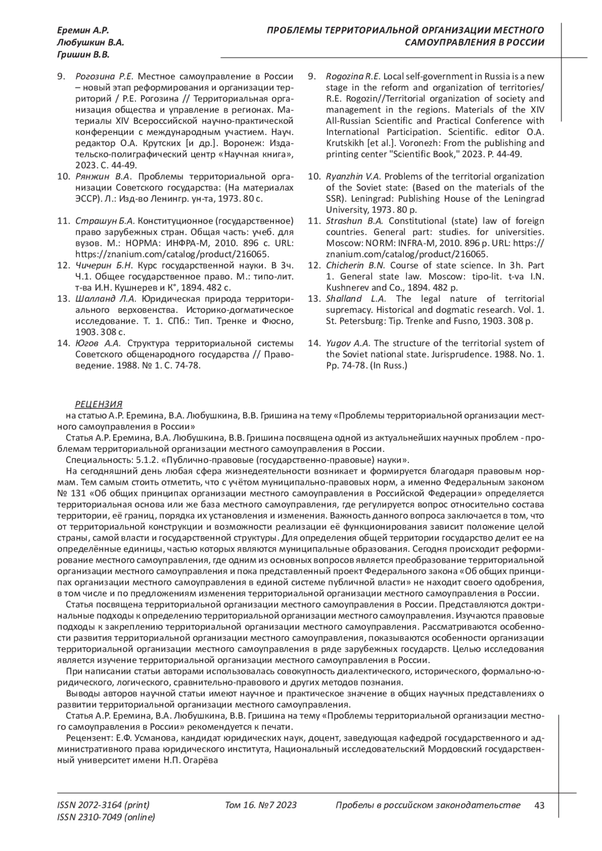 9. Рогозина Р.Е. Местное самоуправление в России - новый этап реформирования и организации территорий / Р.Е. Рогозина // Территориальная организация общества и управление в регионах. Материалы ХIV Всероссийской научно-практической конференции с международным участием. Науч. редактор О.А. Крутских [и др.]. Воронеж: Издательско-полиграфический центр “Научная книга”, 2023. С. 44-49. EDN: VSGXZT