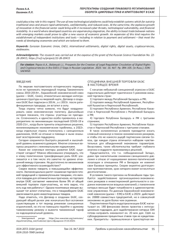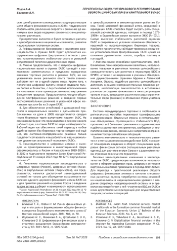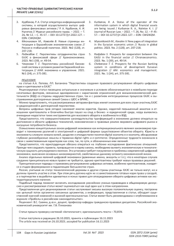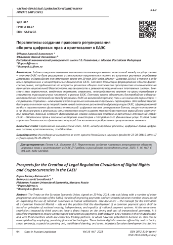 Статья: ПЕРСПЕКТИВЫ СОЗДАНИЯ ПРАВОВОГО РЕГУЛИРОВАНИЯ ОБОРОТА ЦИФРОВЫХ ПРАВ И КРИПТОВАЛЮТ В ЕАЭС (2023)