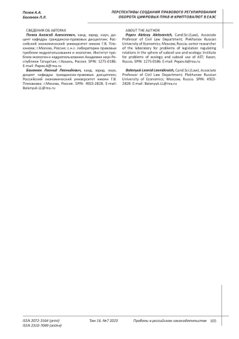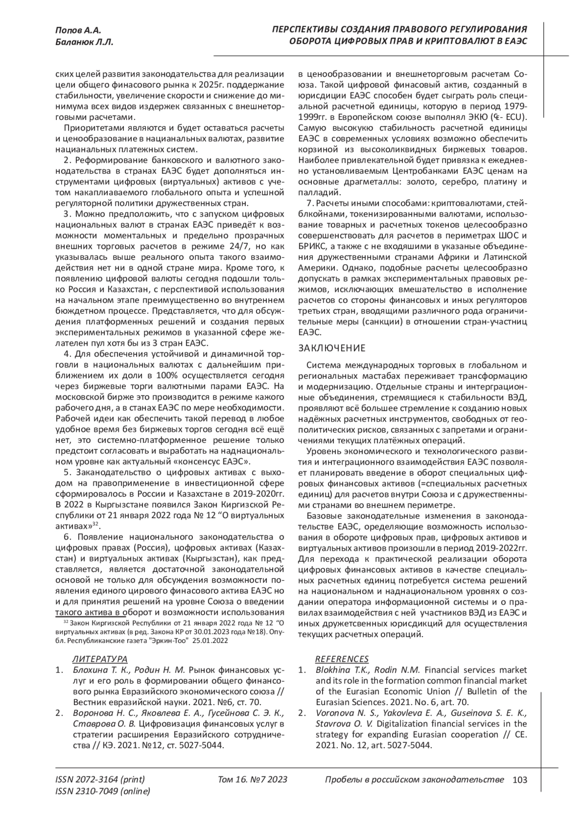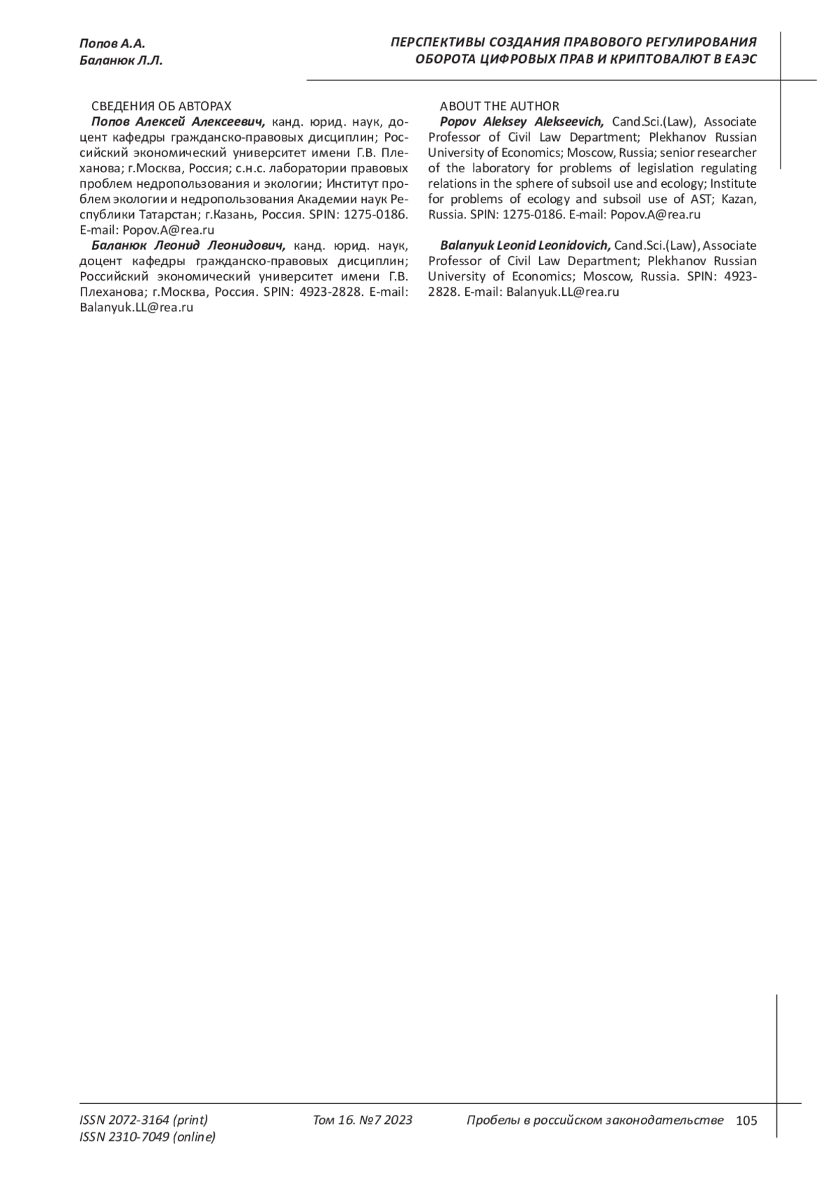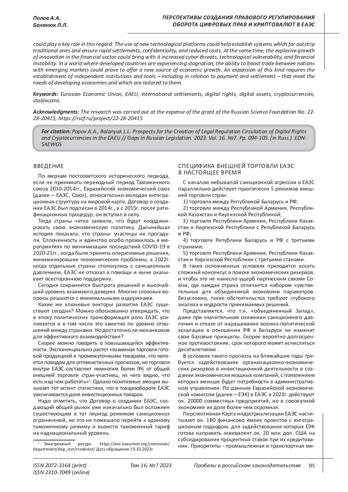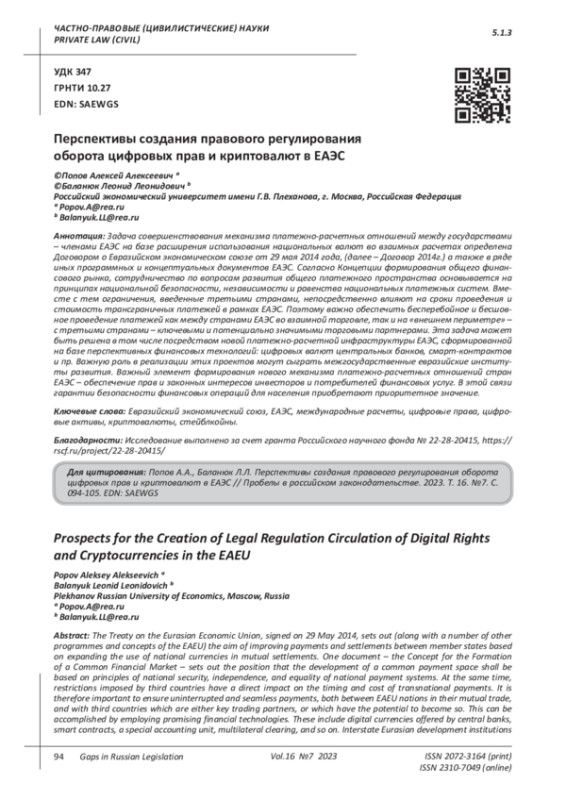 ПОПОВ А. А., БАЛАНЮК Л. Л. ПЕРСПЕКТИВЫ СОЗДАНИЯ ПРАВОВОГО РЕГУЛИРОВАНИЯ ОБОРОТА ЦИФРОВЫХ ПРАВ И КРИПТОВАЛЮТ В ЕАЭС // ПРОБЕЛЫ В РОССИЙСКОМ ЗАКОНОДАТЕЛЬСТВЕ. 2023. Т. 16 № 7 (42 СТ.)