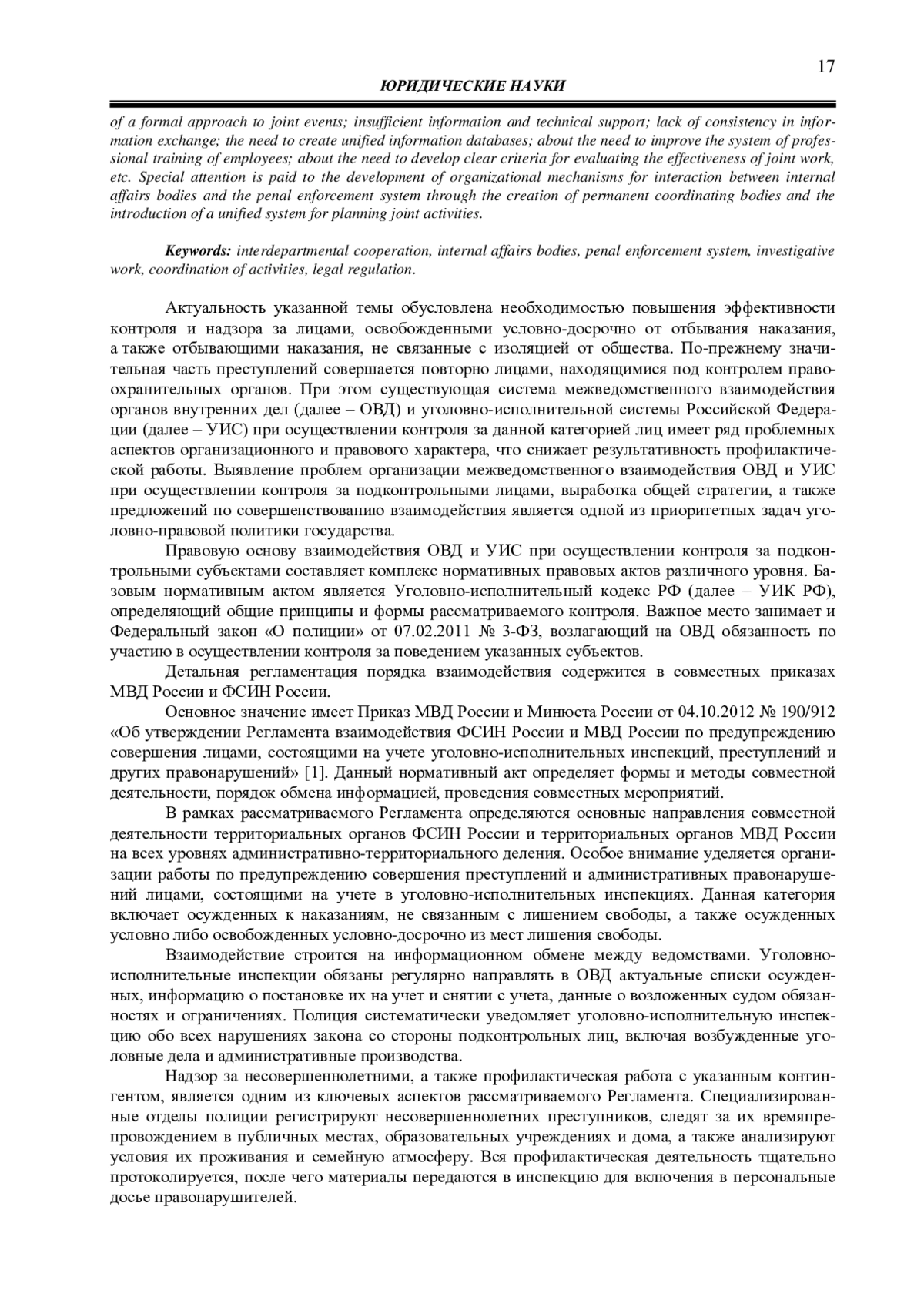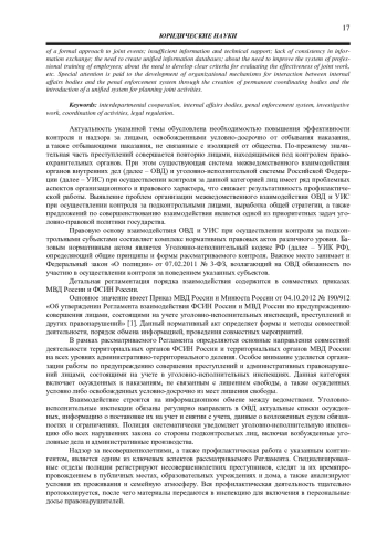 Актуальность указанной темы обусловлена необходимостью повышения эффективности контроля и надзора за лицами, освобожденными условно-досрочно от отбывания наказания, а также отбывающими наказания, не связанные с изоляцией от общества. По-прежнему значительная часть преступлений совершается повторно лицами, находящимися под контролем правоохранительных органов. При этом существующая система межведомственного взаимодействия органов внутренних дел (далее – ОВД) и уголовно-исполнительной системы Российской Федерации (далее – УИС) при осуществлении контроля за данной категорией лиц имеет ряд проблемных аспектов организационного и правового характера, что снижает результативность профилактической работы.