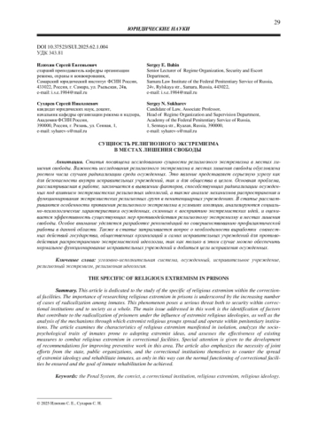 Статья посвящена исследованию сущности религиозного экстремизма в местах лишения свободы. Важность исследования религиозного экстремизма в местах лишения свободы обусловлена ростом числа случаев радикализации среди осужденных. Это явление представляет серьезную угрозу как для безопасности внутри исправительных учреждений, так и для общества в целом. Основная проблема, рассматриваемая в работе, заключается в выявлении факторов, способствующих радикализации осужденных под влиянием экстремистских религиозных идеологий, а также анализе механизмов распространения и функционирования экстремистских религиозных групп в пенитенциарных учреждениях. В статье рассматриваются особенности проявления религиозного экстремизма в условиях изоляции, анализируются социально-психологические характеристики осужденных, склонных к восприятию экстремистских идей, и оценивается эффективность существующих мер противодействия религиозному экстремизму в местах лишения свободы. Особое внимание уделяется разработке рекомендаций по совершенствованию профилактической работы в данной области. Также в статье затрагивается вопрос о необходимости выработки совместных действий государства, общественных организаций и самих исправительных учреждений для противодействия распространению экстремистской идеологии, так как только в этом случае можно обеспечить нормальное функционирование исправительных учреждений и добиться цели исправления осужденных.