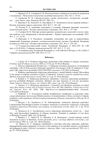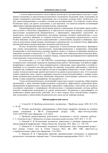 6. Пащенко И. В. Современные практики дерадикализации осужденных за проявление религиозного экстремизма: мировой опыт // Отечественная юриспруденция. 2016. С. 26-33. EDN: XINDXJ