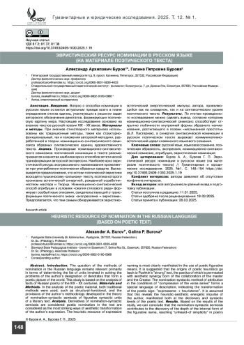 Анализ. Производные номинационно-синтаксического семиозиса поэтической номинации в тексте рассматриваются в качестве наиболее ярких способов эстетической трансформации авторской экспрессии. Наиболее ярко эвристический ресурс экспрессивного наименования проявляется при употреблении поэтических образных средств. Высказывается предположение, что истоки поэтической эвристики восходят к пушкинскому «сильному» тексту, поэтика которого пронизана эстетической синергией, рожденной соработничеством мастера и Творца. Номинационно-синтаксический способ атрибуции в условиях «сжатия стихового ряда» формирует особый язык описания, свидетельствующий о трансформации поэтического знака: «экспрессема → эвристема». Предполагается, что тем самым обнаруживается эвристикоэстетический энергетический импульс автора, проявляющийся как на словарном, так и на синтаксическом уровне поэтического текста.