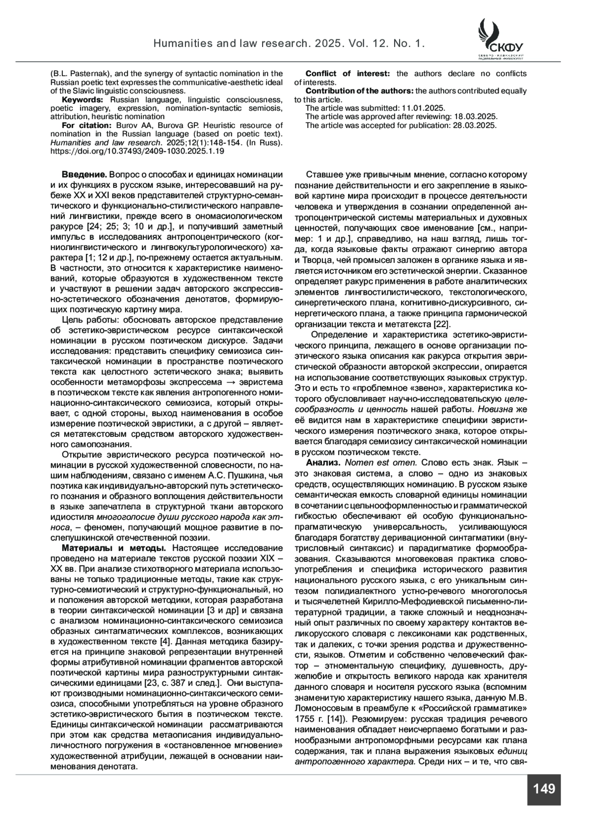 Результаты. По итогам проведенного исследования можно сделать вывод, согласно которому номинационно-синтаксический семиозис способствует открытию глубинности внутренней формы образного наименования, достигающего в поэзии «неслыханной простоты» (Б. Л. Пастернак), а синергия синтаксической номинации в русском поэтическом тексте выражает коммуникативноэстетический идеал славянского языкового сознания.