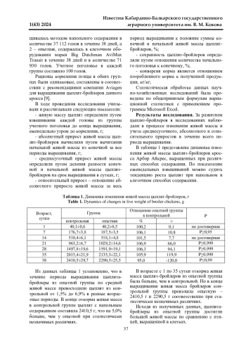 В данной статье представлены результаты исследования, направленного на выявление влияния напольного и клеточного содержания цыплят-бройлеров на эффективность производства мяса. Экспериментальные исследования были проведены в АО «Линдовская птицефабрика - племенной завод» Нижегородской области в период 2022-2023 г. Объектом исследования послужили цыплята-бройлеры кросса Арбор Айкрес. Были исследованы показатели: динамика изменения живой массы, среднесуточные, абсолютные и относительные приросты, сохранность, расход и конверсия корма, убойные показатели (убойный выход, масса тушки), распределение тушек на 1 и 2 сорт, производство мяса за всю партию и на 1 м2 производственной площади птичников. Дана сравнительная характеристика полученных показателей и рассчитана экономическая эффективность производства мяса цыплят-бройлеров. Установлено, что показатели живой массы, среднесуточных и абсолютных приростов, а также убойные показатели у группы цыплят-бройлеров с напольным содержанием превосходили над сверстниками опытной группы. В то же время показатели сохранности, расхода и конверсии корма, производства мяса на 1 м2 были лучше у группы с клеточным содержанием. В результате расчета экономической эффективности было установлено, что при использовании клеточного способа содержания прибыль с 1 кг реализуемой продукции больше на 7,69%, чем при использовании напольного способа содержания. При клеточном содержании цыплят-бройлеров уровень рентабельности производства повышается на 3,9% по сравнению с напольным. За счет усиленного использования производственных площадей - расположение клеток в 4 яруса при клеточном способе содержания - можно повысить эффективность производства мяса цыплят-бройлеров.