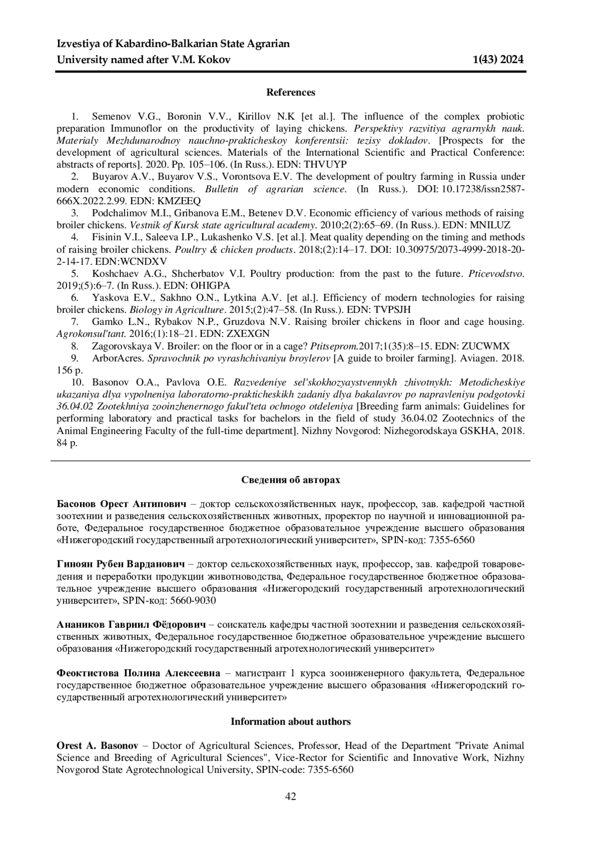 1. Влияние комплексного пробиотического препарата Иммунофлор на продуктивность кур яичного направления / В. Г. Семенов, В. В. Боронин, Н. К. Кириллов, А. Ю. Лаврентьев, С. С. Козак, О. А. Басонов, Н. Г. Иванов // Перспективы развития аграрных наук. Материалы Международной научно-практической конференции: тезисы докладов. 2020. С. 105-106. EDN: THVUYP
