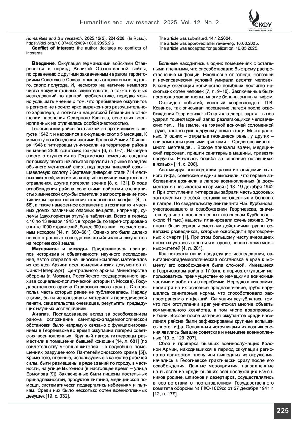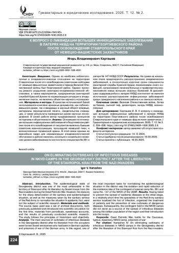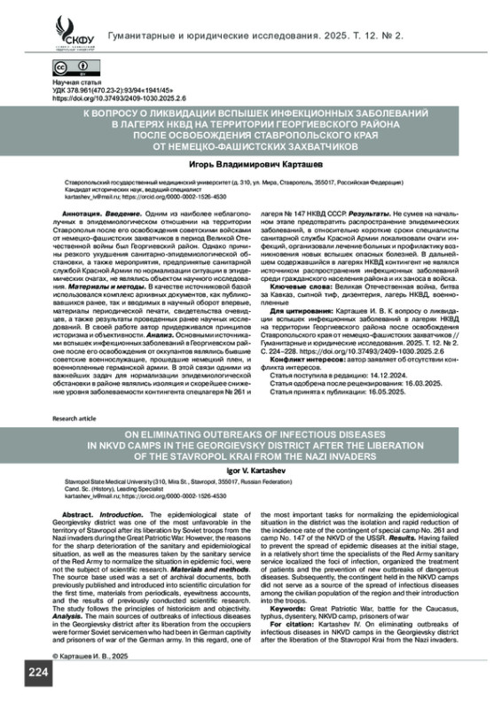 Введение. Одним из наиболее неблагополучных в эпидемиологическом отношении на территории Ставрополья после его освобождения советскими войсками от немецко-фашистских захватчиков в период Великой Отечественной войны был Георгиевский район. Однако причины резкого ухудшения санитарно-эпидемиологической обстановки, а также мероприятия, предпринятые санитарной службой Красной Армии по нормализации ситуации в эпидемических очагах, не являлись объектом научного исследования.