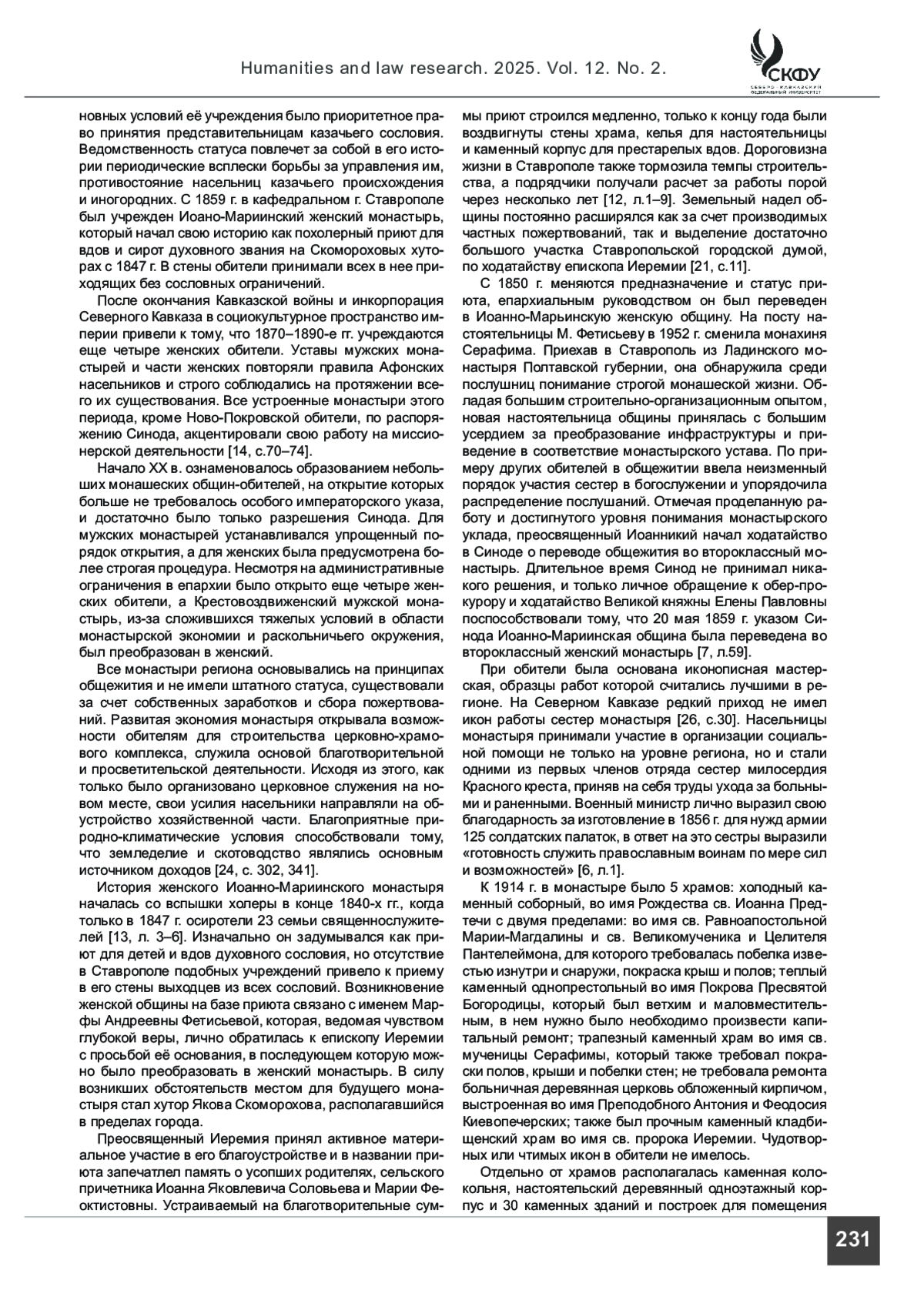 Введение. Православное женское подвижничество на Северном Кавказе особая страница истории региона, о которой мало что известно. Причина заключается в том, что если ставропигиальные женские обители России были включены в общероссийские процессы, и о них сохранились сведения, то на окраинах страны они вели уединенную христианскую жизнь и редко становились центрами общественного внимания. Апеллируя к обрывочным сведениям архивных документов, авторам удалось проследить общие тенденции их развития в регионе, выделить специфические особенности положения отдельных из них.