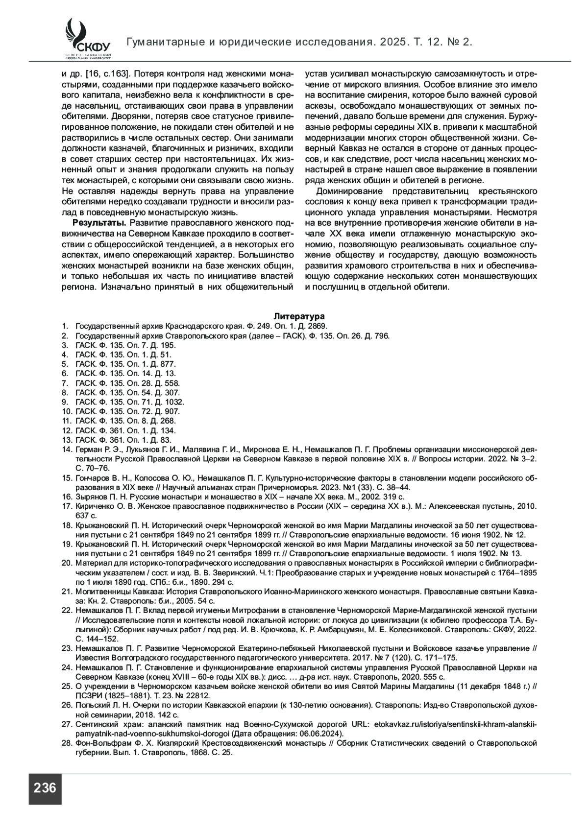 22. Немашкалов П. Г. Вклад первой игуменьи Митрофании в становление Черноморской Марие-Магдалинской женской пустыни // Исследовательские поля и контексты новой локальной истории: от локуса до цивилизации (к юбилею профессора Т.А. Булыгиной): Сборник научных работ / под ред. И. В. Крючкова, К. Р. Амбарцумян, М. Е. Колесниковой. Ставрополь: СКФУ, 2022. С. 144-152.