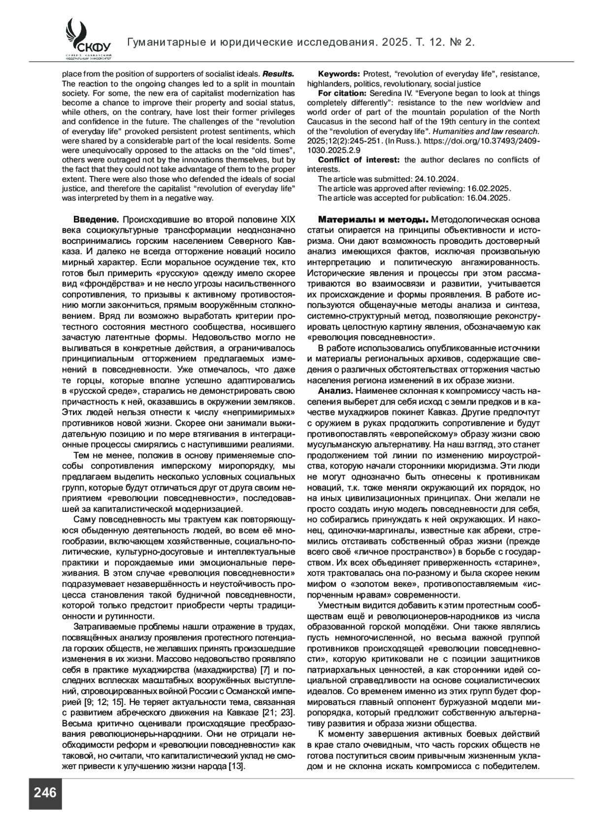 Материалы и методы. В статье на основании общенаучных методов анализа и синтеза, системно-структурного метода реконструируется целостная картина явления, обозначаемого как «революция повседневности». Акцент делается на сопротивлении данному процессу со стороны части северокавказского общества.