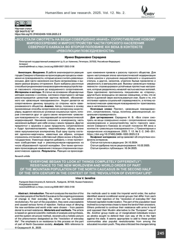 Введение. В работе анализируется реакция горцев Северного Кавказа на происходящие процессы изменения их повседневности, которые можно считать революционными. Для части населения они были неприемлемы и вызвали разные формы отторжения. Были выбраны различные способы отрицания нового мировоззрения и мироустройства– от пассивного отрицания до вооруженного сопротивления.