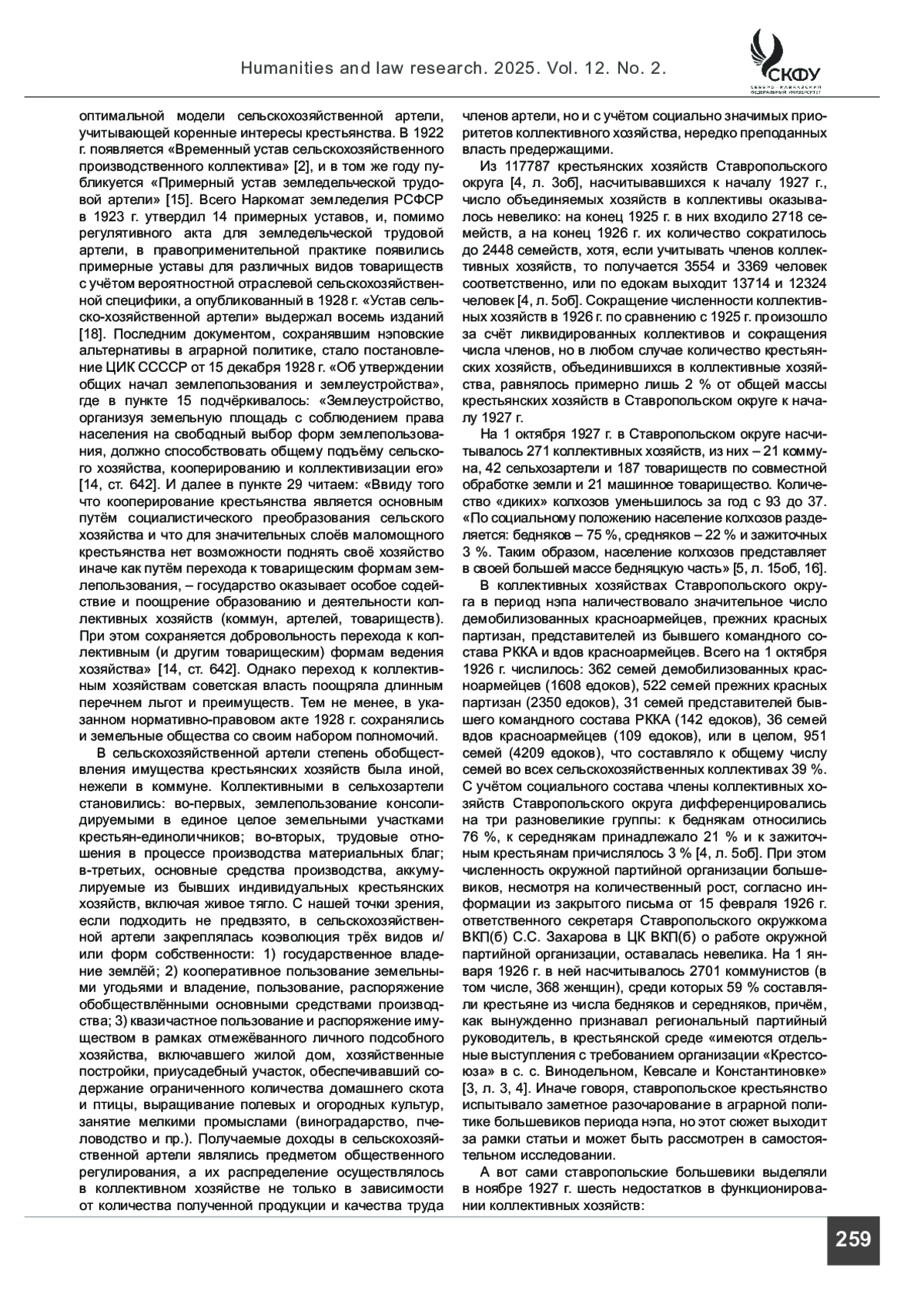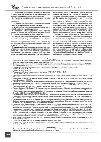 10. Панарин А. А. Роль простейших производственных объединений крестьянства и казачества в восстановлении сельского хозяйства Северного Кавказа (1921-1924 гг.) // Гуманитарные и юридические исследования. 2022. Т. 9 (4). С. 570-576.