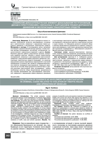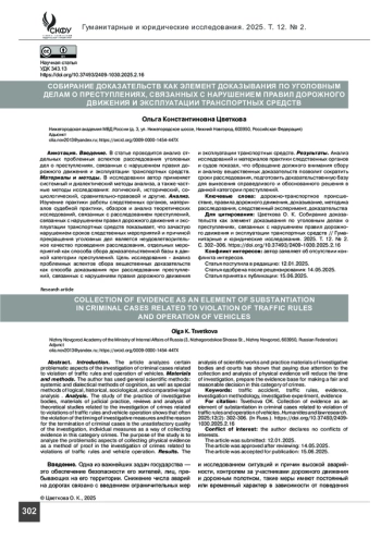 Анализ. Изучение практики работы следственных органов, материалов судебной практики, обзоров и анализ теоретических исследований, связанных с расследованием преступлений, связанных с нарушением правил дорожного движения и эксплуатации транспортных средств показывает, что зачастую нарушением сроков следственных мероприятий и причиной прекращения уголовных дел является неудовлетворительное качество проведения расследования, отдельных мероприятий как способа сбора доказательственной базы в данной категории преступлений. Цель исследования - анализ проблемных аспектов сбора вещественных доказательств как способа доказывания при расследовании преступлений, связанных с нарушением правил дорожного движения и эксплуатации транспортных средств.