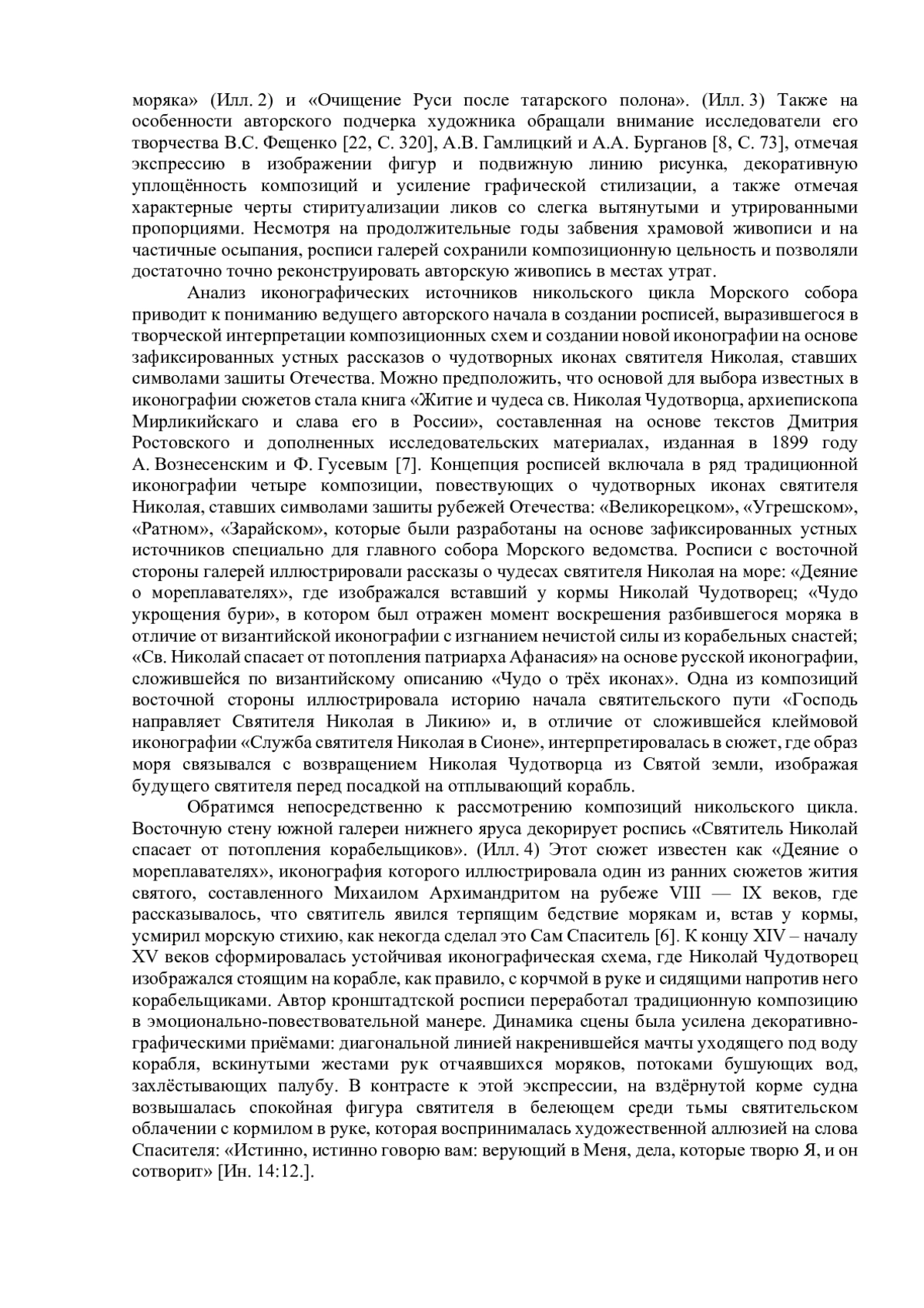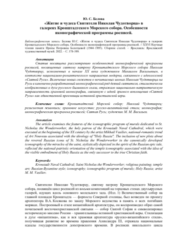 Белова Ю.С. «Житие и чудеса Святителя Николая Чудотворца» в галереях Кронштадтского Морского собора. Особенности иконографической программы росписей. // XXVI Научные чтения памяти Ирины Петровны Болотцевой (1944–1995). Сборник статей. – Ярославль: Ярославский художественный музей. 2022. – С. 378-399.