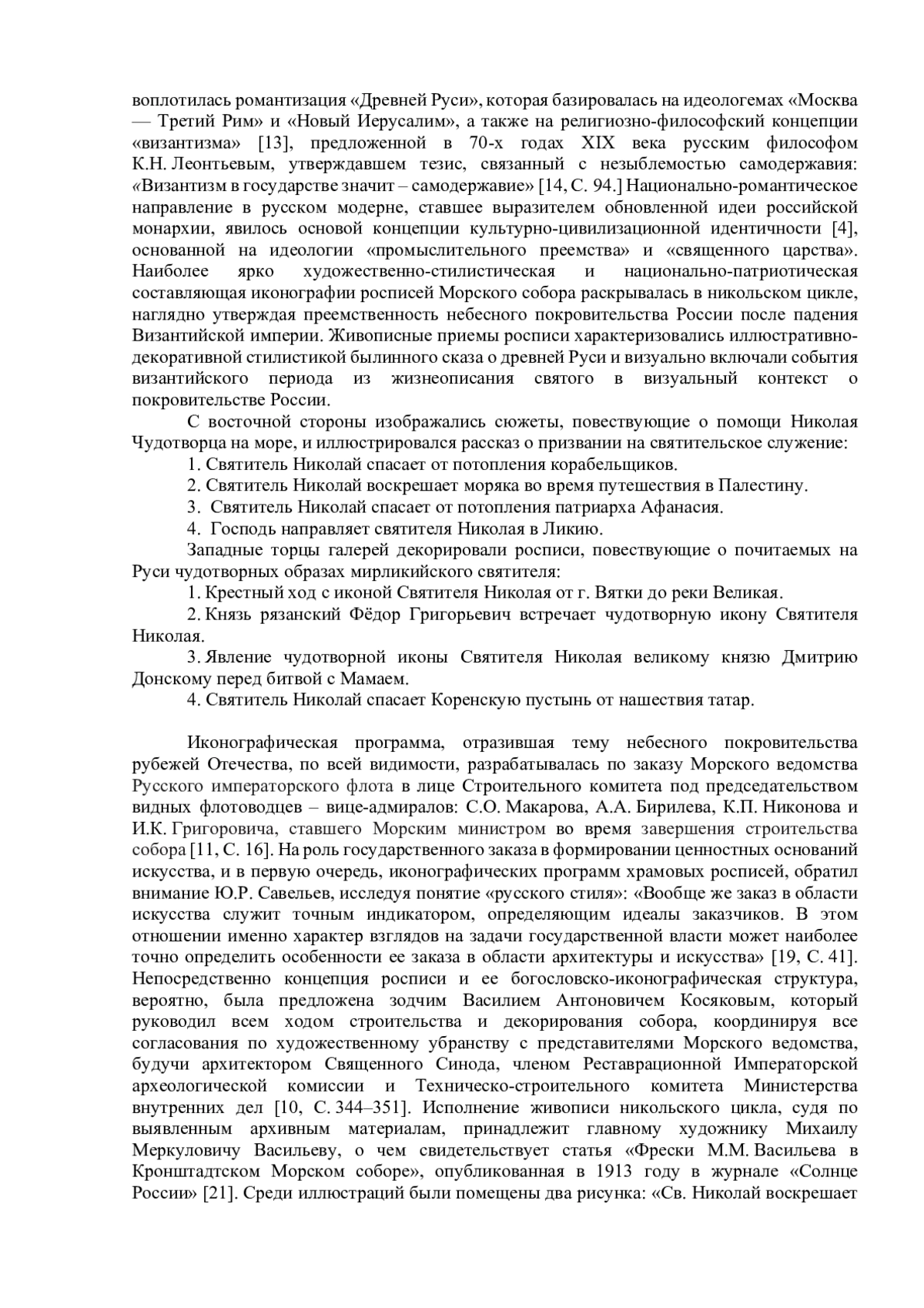 The article examines the features of the iconographic program of murals dedicated to St. Nicholas the Wonderworker, the holy patron of the Kronstadt Naval Cathedral, which were executed at the beginning of the XX century by the artist Mikhail Vasiliev, national-romantic trend of Art Nouveau associated with the ideology of “Holy Russia”. The inclusion of new plots about the revered Russian icons of St. Nicholas the Wonderworker in the canonically developed iconography of the miracles of the saint, stylistically depicted in the spirit of the Russian epic tale, reflected the national-patriotic orientation of the temple iconography associated with the idea of the visible embodiment of Holy Russia as the only successor to the true Christian faith.