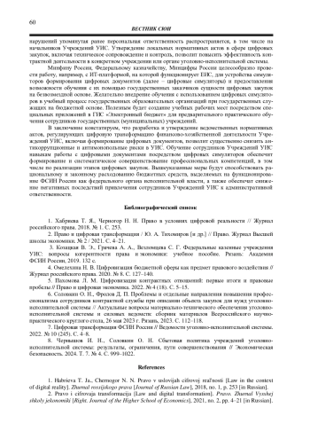 Снизить количество нарушений при выполнении функциональных обязанностей сотрудниками УИС, реализующими цифровые закупки, призвана регламентация конкретных действий на ведомственном уровне, уровне учреждения или органа уголовно-исполнительной системы. Обучение персонала с обязательным формированием компетенций цифровой экономики, включая закупочную деятельность, способствует рациональному и законному расходованию бюджетных средств, выделяемых на функционирование ФСИН России как федерального органа исполнительной власти.